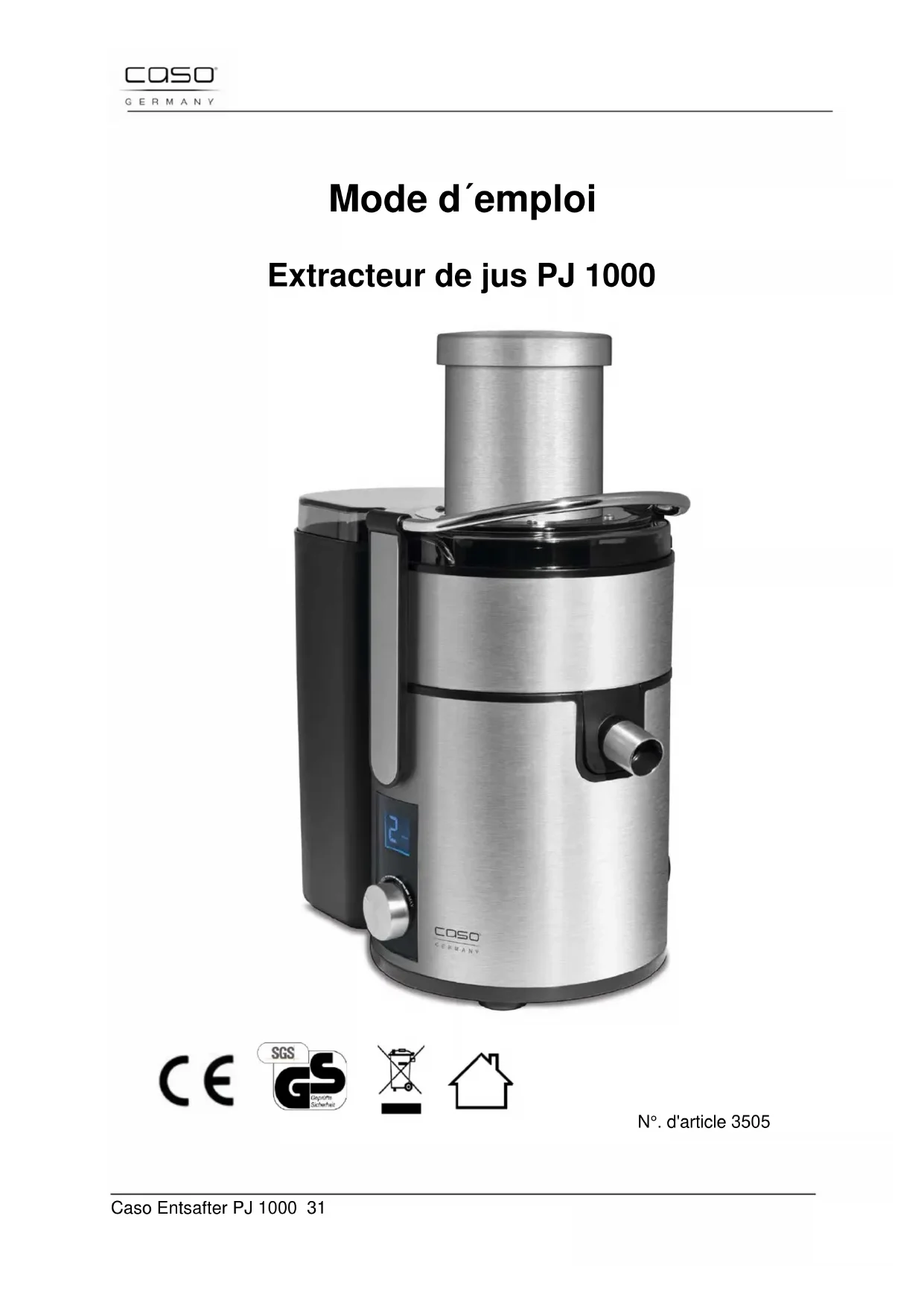 PJ1000 - Extracteur de jus CASO - Notice d'utilisation et mode d'emploi gratuit