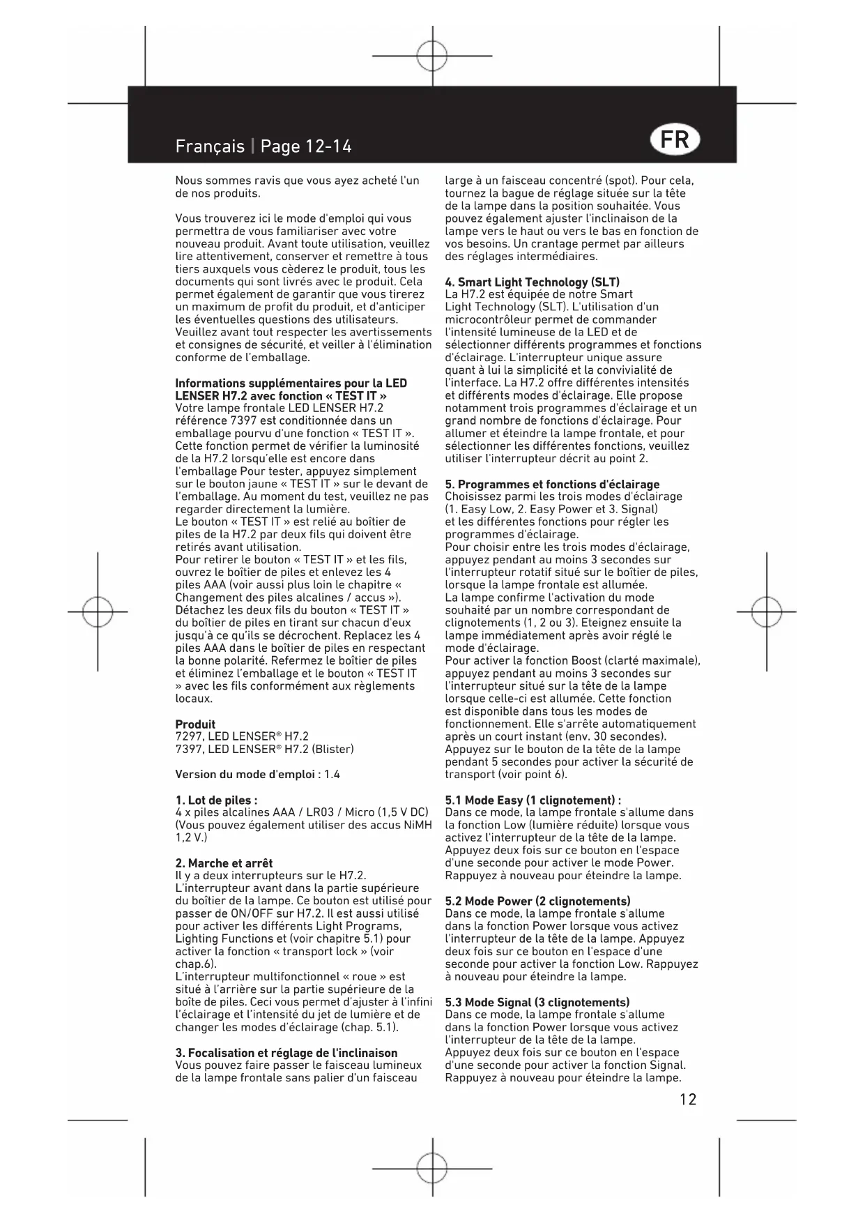 La H7.2 est équipe de notre Smart Light Technology (SLT). L'utilisation d'un microcontrôleur permet de commander l'intensité lumineuse de la LED et de selectionner différents programmes et fonctions d'éclairage. L'interrupteur unique assure quant à lui la simplicité et la convivialité de l'interface. La H7.2 offre différentes intensités et différents modes d'éclairage. Elle propose notamment trois programmes d'éclairage et un grand nombre de fonctions d'éclairage. Pour allumer et étéeindre la lampe frontale, et pour selectionner les différentes fonctions, veillez utiliser l'interrupteur décrit au point 2.