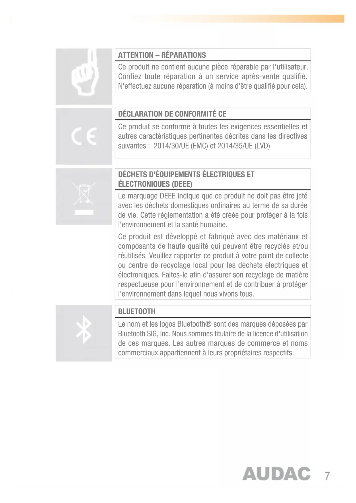 Ce mode d'emploi a été rédigé avec le plus grand soin et est aussi complat que possible à la date de publication. Toutefois, des mises à jour des caractéristiques techniques, des fonctionnalités ou du logiciel peuvent avoir eu lieu depuis la publication. Pour obtenir la première version du mode d'emploi et du logiciel, veuillez visiter le site web d'Audac (www.audac.eu).