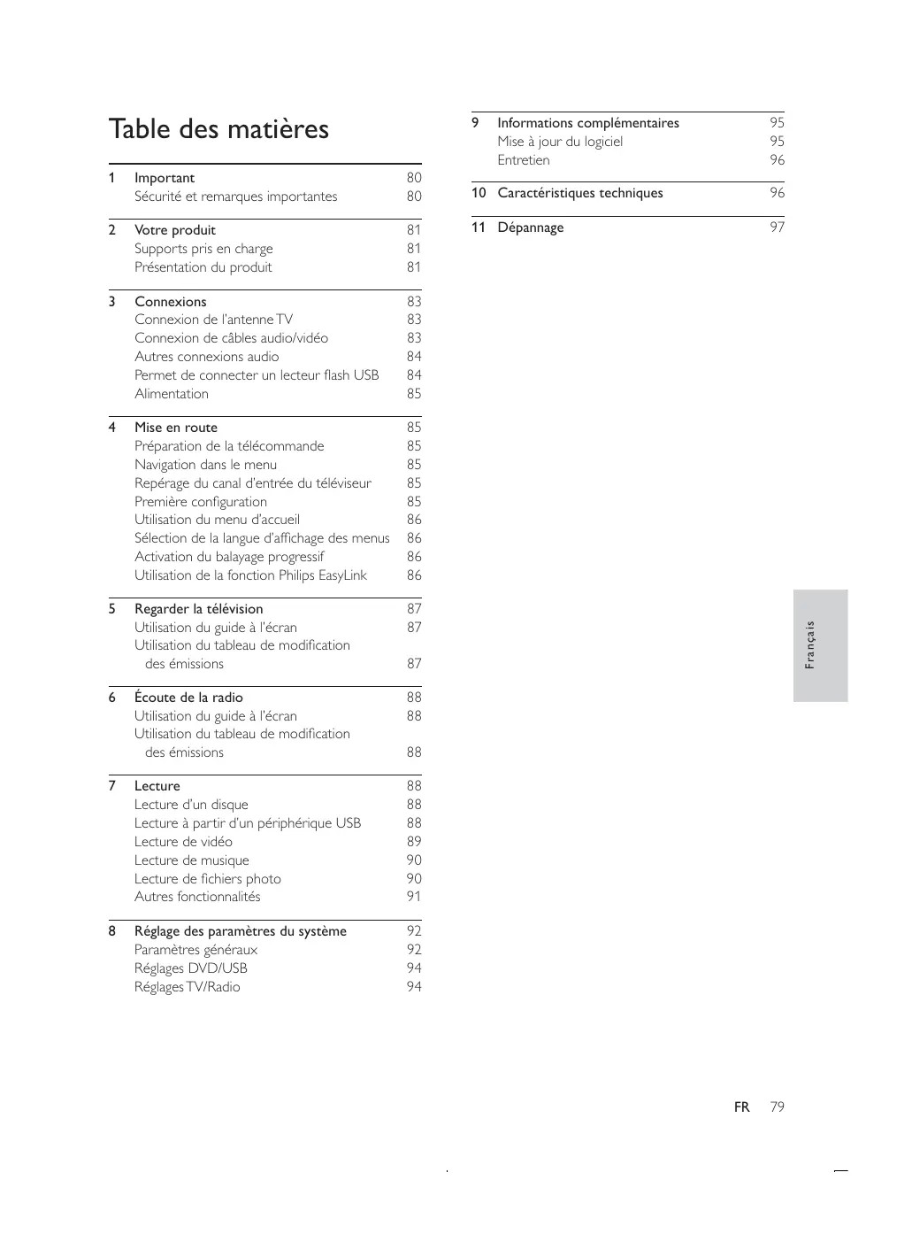 Mise en route Préparation de la télécommande Navigation dans le menu Repérage du canal d’entrée du téléviseur 3UHPLqUHFRQÀJXUDWLRQ Utilisation du menu d’accueil 6pOHFWLRQGHODODQJXHG·DIÀFKDJHGHVPHQXV Activation du balayage progressif Utilisation de la fonction Philips EasyLink