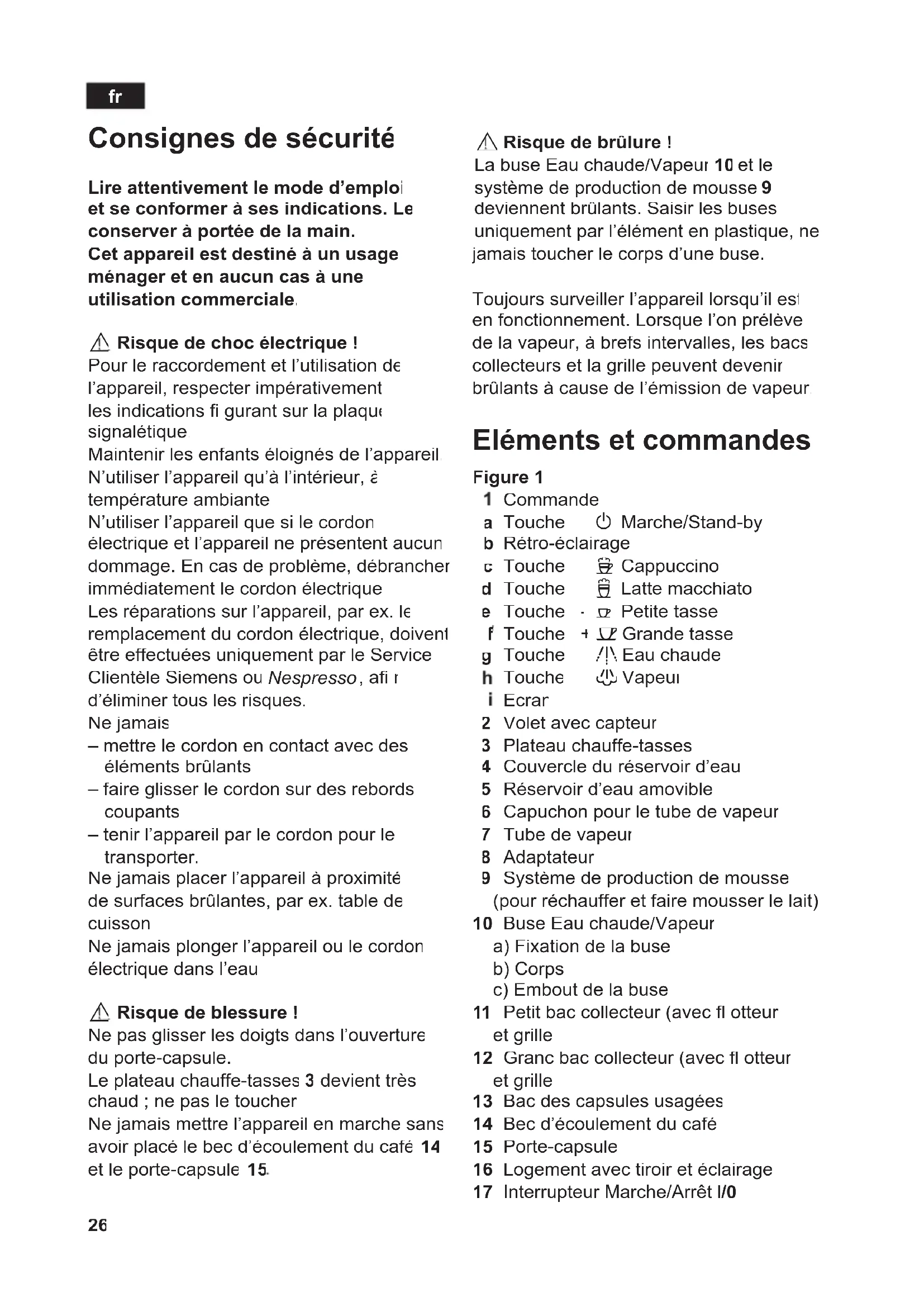 Risque de choc électrique ! Pour le raccordement et l’utilisation de l’appareil, respecter impérativement les indications fi gurant sur la plaque signalétique. Maintenir les enfants éloignés de l’appareil. N’utiliser l’appareil qu’à l’intérieur, à température ambiante. N’utiliser l’appareil que si le cordon électrique et l’appareil ne présentent aucun dommage. En cas de problème, débrancher immédiatement le cordon électrique. Les réparations sur l’appareil, par ex. le remplacement du cordon électrique, doivent être effectuées uniquement par le Service Clientèle Siemens ou Nespresso , afi n d’éliminer tous les risques. Ne jamais – mettre le cordon en contact avec des éléments brûlants – faire glisser le cordon sur des rebords coupants – tenir l’appareil par le cordon pour le transporter. Ne jamais placer l’appareil à proximité de surfaces brûlantes, par ex. table de cuisson. Ne jamais plonger l’appareil ou le cordon électrique dans l’eau.