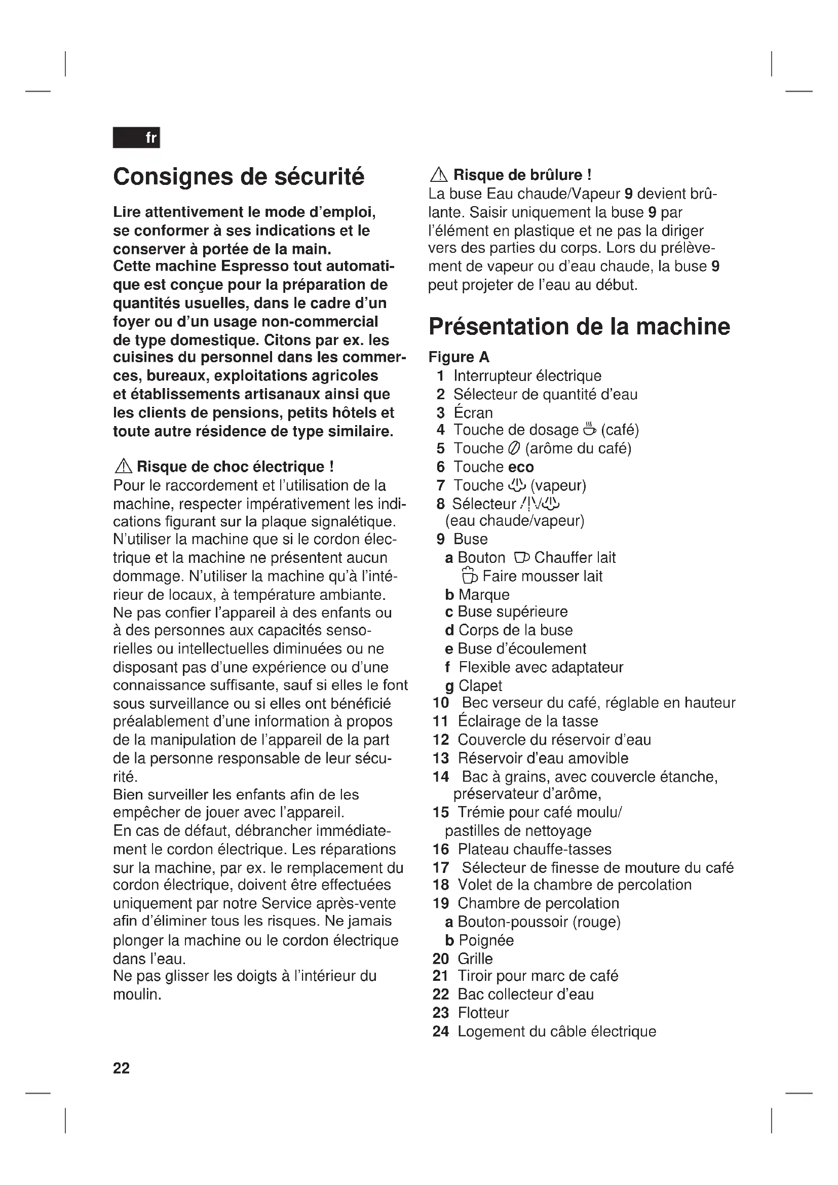 ! Risque de brlure !Risque de brlure ! La buse Eau chaude/Vapeur 9 devient brû- lante. Saisir uniquement la buse 9 par l’élément en plastique et ne pas la diriger vers des parties du corps. Lors du prélève- ment de vapeur ou d’eau chaude, la buse 9 peut projeter de l’eau au début. Présentation de la machine Figure A 1 Interrupteur électrique 2 Sélecteur de quantité d’eau 3 Écran 4 Touche de dosage 4 (café) 5 Touche 5 (arôme du café) 6 Touche eco 7 Touche h (vapeur) 8 Sélecteur g/h (eau chaude/vapeur) 9 Buse a Bouton V Chauffer lait W Faire mousser lait b Marque c Buse supérieure d Corps de la buse e Buse d’écoulement f Flexible avec adaptateur g Clapet 10 Bec verseur du café, réglable en hauteur 11 Éclairage de la tasse 12 Couvercle du réservoir d’eau 13 Réservoir d’eau amovible 14 Bac à grains, avec couvercle étanche, préservateur d’arôme, 15 Trémie pour café moulu/ pastilles de nettoyage 16 Plateau chauffe-tasses 17 Sélecteur de nesse de mouture du café 18 Volet de la chambre de percolation 19 Chambre de percolation a Bouton-poussoir (rouge) b Poignée 20 Grille 21 Tiroir pour marc de café 22 Bac collecteur d’eau 23 Flotteur 24 Logement du câble électrique23 defr Cette machine est dotée d’un mode « eco » qui permet une consommation électrique réduite. En Mode « eco », il est possible de préparer normalement du café ou de la vapeur. Une fois le bouton correspondant appuyé, la machine effectue le chauffage comme à l’habitude ; le temps nécessaire pour préparer du café ou de la vapeur est légèrement plus long. Pour tirer de l’eau chaude, appuyez tout d’abord sur le bouton eco ; la machine chauffe brièvement. Il est ensuite possible de prélever normalement de l’eau chaude. i La machine est programmée en usine an de fonctionner de manière optimale. Remarque : lors de la première utilisation ou après une période d’arrêt prolongée, la première tasse de café n’a pas tout l’arôme désiré et il est donc conseillé de ne pas la boire. Eléments de commande 1 Interrupteur électrique L’interrupteur électrique 1 au dos de la machine ferme et ouvre l’alimentation électrique. Une fois que l’interrupteur a été placé en position marche, la machine chauffe et effectue un rinçage ; elle est ensuite prête à fonctionner. La machine n’effectue pas de rinçage lorsqu’elle est encore chaude lors de la mise en marche. Attention Ne pas actionner l’interrupteur en cours de fonctionnement. Avant d’arrêter la machine, appuyer sur le bouton eco pour lancer le rinçage automatique. Ensuite, arrêtez à l’aide de l’interrupteur. Avant la première utilisation Généralités Utiliser uniquement de l’eau pure, sans gaz carbonique et de préférence du café en grain pour espresso ou pour percolateur. Ne pas employer des grains de café avec glaçage, des grains caramélisés ou enrobés d’une substance sucrée quelconque ; ils encrassent et obturent le broyeur. Se servir de la bandelette fournie pour déterminer la dureté de l’eau. Si la dureté est différente de la valeur 4, programmer la machine à café en conséquence (voir point « Régler la dureté de l’eau »). Mise en service de la machine Placez la machine sur une surface plane et résistante à l’eau. Extraire du logement la longueur de cordon électrique nécessaire et brancher dans une prise. Retirer le réservoir d'eau 13, le rincer puis le remplir d’eau froide. Attention de ne pas dépasser le repère «max». Placer le réservoir d'eau 13 bien vertical et appuyer pour le faire descendre. Remplir de café le bac à grains. S'assurer que le sélecteur 8 est bien placé sur