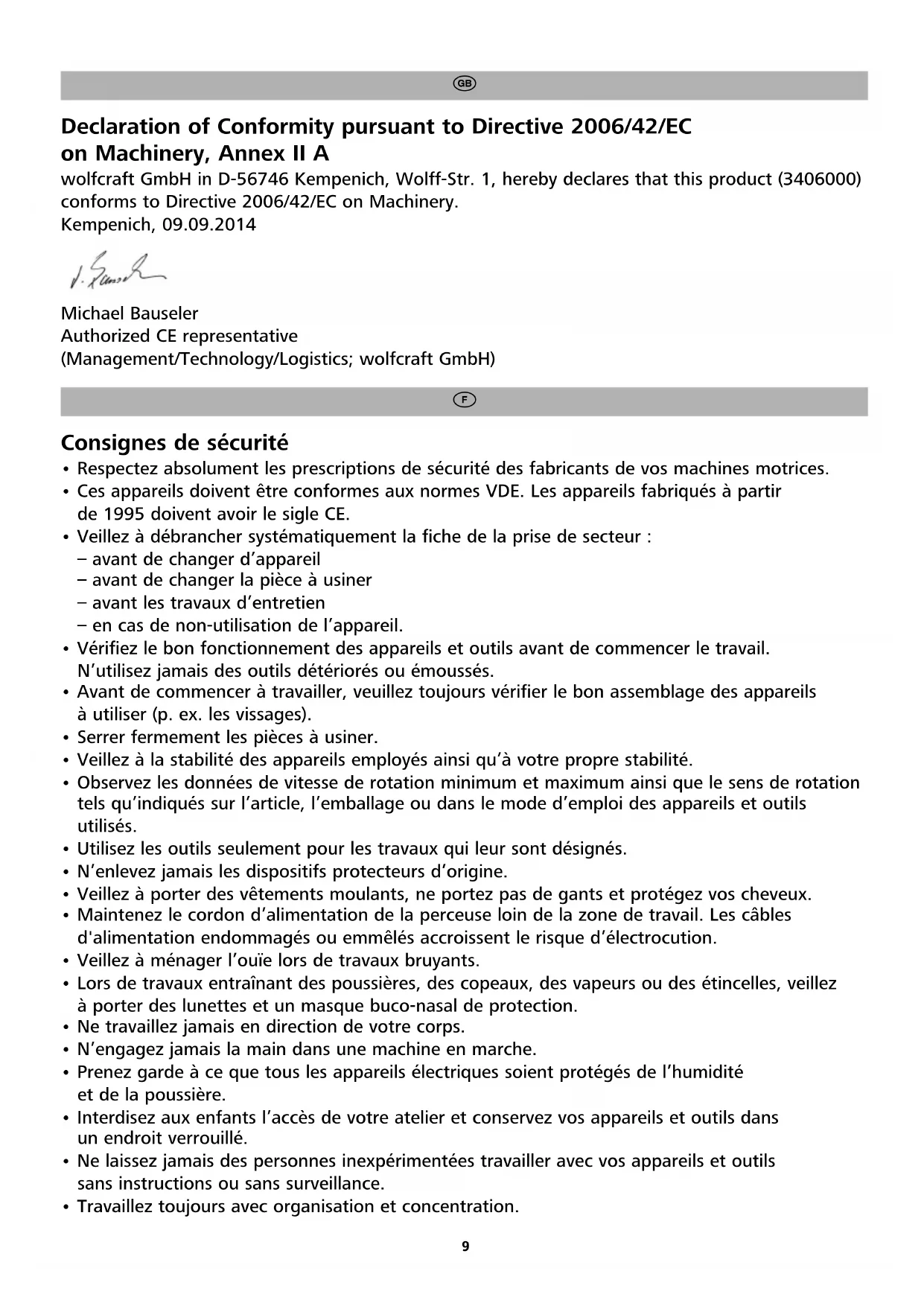 ne restreint pas vos droits légaux en tant que consommateur (droits à mise en conformité, résiliation ou minoration, dommages et intérêts ou remboursement de la dépense). Déclaration de conformité suivant la Directive Machines CE 2006/42/CE, annexe II A La Sté wolfcraft GmbH, sise à D-56746 Kempenich, Wolff Str. 1, déclare par la présente que ce produit (3406000) est conforme à la directive machines 2006/42/CE. Kempenich, le 09.09.2014 Michael Bauseler Chargé de mission CE et fondé de pouvoir (Direction commerciale/Technique/Logistique ; wolfcraft GmbH)