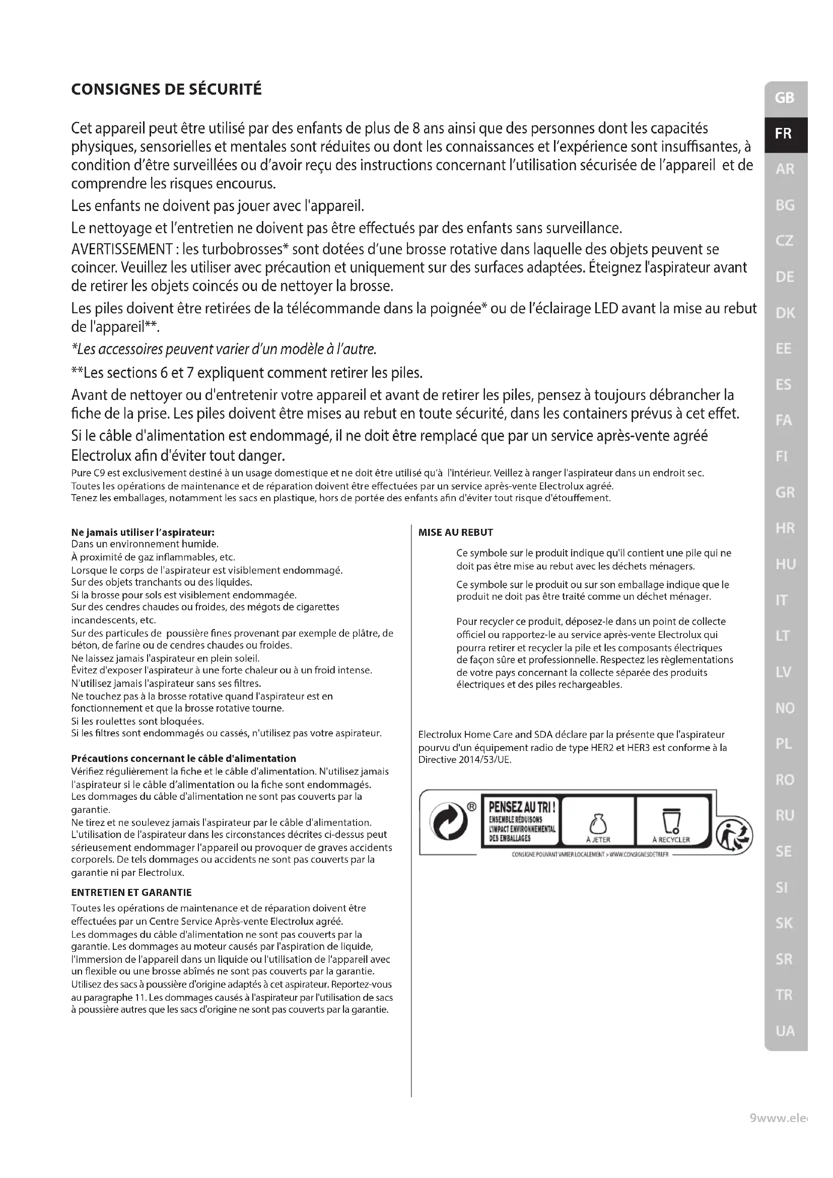Ce symbole sur le produit indique qu'il contient une pile qui ne doit pas être mise au rebut avec les déchets ménagers. Ce symbole sur le produit ou sur son emballage indique que le produit ne doit pas être traité comme un déchet ménager. Pour recycler ce produit, déposez-le dans un point de collecte ociel ou rapportez-le au service après-vente Electrolux qui pourra retirer et recycler la pile et les composants électriques de façon sûre et professionnelle. Respectez les règlementations de votre pays concernant la collecte séparée des produits électriques et des piles rechargeables. Electrolux Home Care and SDA déclare par la présente que l'aspirateur pourvu d'un équipement radio de type HER2 et HER3 est conforme à la Directive 2014/53/UE.