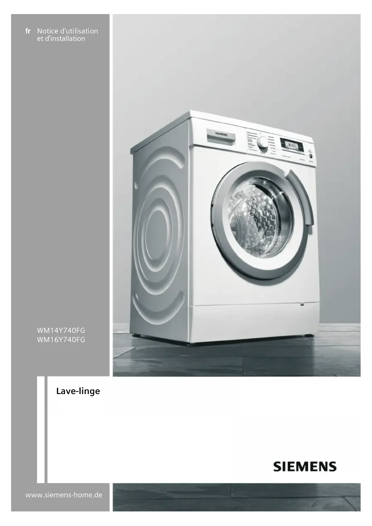www.siemens-home.de fr Notice d'utilisation et d'installation WM14Y740FG WM16Y740FG Lave-linge2 Présentation de votre nouveau lave-linge Vous venez d’opter pour un lave-linge premium de marque Siemens. Grâce à ses technologies innovantes, ce lave-linge se distingue par sa performance de lavage parfaite et par une consommation économe d’eau et d’énergie. Prenez quelques minutes pour lire la notice et découvrir les avantages de votre lave-linge. Pour être à la hauteur de l’ambition de qualité dont la marque Siemensest synonyme, chaque lave-linge subit un contrôle de fonctionnement et d'impeccabilité d'état avant de quitter notre usine. Pour plus d'informations sur nos produits, nos accessoires, nos pièces de rechange et nos services, consultez notre site Internet www.siemens-home.com ou adressez-vous à nos centres de service après-vente. Dans le cas où les notices d'installation et d'utilisation décrivent plusieurs modèles, les différences sont clairement spécifiées le cas échéant. Explication des symboles ã Avertissement ! Cette combinaison d’un symbole et d’un mot phare vous prévient d'une situation dangereuse pouvant entraîner la mort ou des blessures graves si vous ne l'évitez pas. ã Attention ! Cette combinaison d’un symbole et d’un mot phare vous prévient d’une situation dangereuse pouvant entraîner des blessures mineures ou légères, ou des provoquer des dégâts matériels et environnementaux.