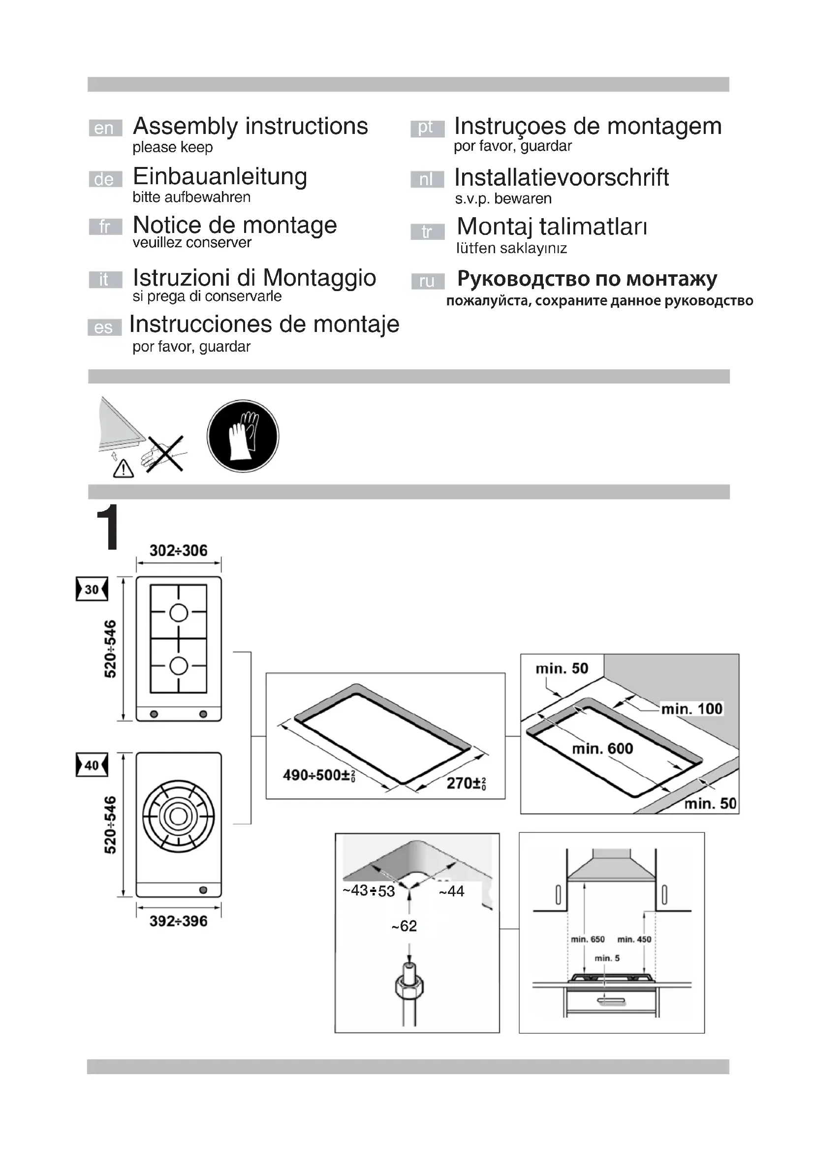 Lisez les instructions de l'appareil avant de procéder à son installation et à son utilisation.Les graphiques représentés dans cette Notice de montage sont purement à caractère informatif. Le fabricant est exempt de toute responsabilité si les indications de ce manuel ne sont pas respectées. Indications de sécurité Tous les travaux d'installation, de réglage et d'adaptation à un autre type de gaz doivent être réalisés par un technicien habilité qui doit respecter les normes et la législation applicables, ainsi que les prescriptions des sociétés locales fournisseuses d'électricité et de gaz. Avant toute action, coupez l'alimentation électrique et de gaz de l'appareil. Il est recommandé d'appeler le Service Technique pour l'adaptation à un autre type de gaz. Cet appareil n'a été conçu que pour un usage domestique ; son usage commercial ou professionnel n'est en aucun cas permis. Cet appareil ne peut pas être installé dans des yachts ou des caravanes. La garantie ne sera valable que si l'usage pour lequel il a été conçu a été respecté. Avant l'installation, vous devez vérifier que les conditions de distribution locale (nature et pression du gaz) et le réglage de l'appareil sont compatibles (voir tableau I). Les conditions de réglage de l'appareil sont inscrites sur l'étiquette ou la plaque signalétique. Cet appareil ne peut être installé que dans un endroit bien ventilé, en respectant les règlements en vigueur et les dispositions relatives à la ventilation. L'appareil ne doit pas être connecté à un dispositif d'évacuation des produits de combustion. Le câble d'alimentation doit être fixé au meuble pour qu'il ne touche pas des parties chaudes du four ou de la plaque de cuisson. Les appareils alimentés électriquement doivent être obligatoirement connectés à la terre. Ne manipulez pas l'intérieur de l'appareil. Le cas échéant, appelez notre Service Technique. Avant l'installation Cet appareil correspond à la classe 3, selon la norme EN 30-1-1 pour les appareils à gaz : appareil encastré dans un meuble. Ces appareils peuvent être combinés entre eux, et/ou avec des plaques de cuisson conventionnelles de la même marque, en utilisant l'accessoire d'union. Consultez le catalogue. Les meubles situés à proximité de l'appareil doivent être fabriqués dans des matériaux non inflammables. Les revêtements stratifiés et la colle qui les fixe doivent être résistants à la chaleur. Cet appareil ne peut pas être installé sur des réfrigérateurs, des machines à laver le linge, des lave-vaisselle ou d'autres appareils semblables. Pour installer la table de cuisson sur un four, celui-ci doit disposer d'une ventilation forcée. Vérifiez les dimensions du four dans le manuel d'installation. Si une hotte aspirante est installée, il faut respecter les observations de son manuel d'installation, et respecter toujours une distance verticale minimum de 650 mm par rapport à la plaque de cuisson. Préparation du meuble (fig.1-2) Effectuez une découpe sur la surface de travail selon les dimensions nécessaires. Si la plaque de cuisson est électrique ou mixte (gaz et électricité) et s'il n'y a pas de four dessous, placez un séparateur de matériau non inflammable (p. ex. métal ou bois contreplaqué) à 10 mm de la base de la plaque de cuisson. Ainsi est empêché l'accès à la partie inférieure de celle-ci. Si la table de cuisson est à gaz, il est recommandé de placer le séparateur à la même distance. Pour des surfaces de travail en bois, vernissez les surfaces de découpe avec une colle spéciale, pour les protéger de l'humidité. Installation de l'appareil Remarque : Pour l'encastrement de l'appareil, utiliser des gants de protection. Les agrafes et le joint adhésif (bord inférieur de la plaque de cuisson) sont posées en usine et ne sont à retirer en aucun cas. Le joint garantit l'étanchéité de toute la surface de travail et évite les infiltrations. Pour fixer l’appareil au meuble d’encastrement, après avoir placé le plan de travail dans sa position de travail, vous devrez dévisser chaque agrafe jusqu’à ce qu’elle tourne librement (il n’est pas nécessaire de dévisser complètement). Encastrez et centrez la plaque de cuisson. Appuyez sur ses extrémités jusqu'à ce qu'elle s'appuie sur tout son périmètre. Tournez les agrafes et serrez-les à fond. Fig. 3. Démontage de la plaque de cuisson Débranchez l'appareil des prises de courant électrique et du gaz. Dévissez les agrafes et procédez de manière inverse para rapport au montage. Branchement de gaz (fig. 4) L'extrémité du branchement d'entrée de la plaque de cuisson à gaz est munie d'un filet d'un demi pouce (20,955 mm), qui permet : - La connexion rigide. - Le raccordement avec un tuyau flexible métallique (L min. 1 m - max. 3 m). Pour créer une liaison conique, installez l'accessoire (référence 427950) et le joint (référence 034308) (contenus dans la livraison ou disponibles auprès du service après- vente) entre le tuyau d'entrée de la plaque de cuisson à gaz et la conduite d'arrivée de gaz. Fig. 4a. Dans ce cas, il faut éviter le contact de ce tuyau avec des parties mobiles de l'unité d'encastrement (par exemple un tiroir) et le passage à travers des espaces pouvant s'obstruer. Si vous avez besoin d’effectuer un branchement de gaz horizontal, notre Service Technique dispose d’un coude, référence 173018, plus un joint, référence 034308. Fig. 4b. Attention ! Si vous manipulez un branchement, vérifiez son étanchéité. Risque de fuites ! Le fabricant ne pourra être tenu responsable si un branchement quelconque présente des fuites après avoir été manipulé. Branchement électrique (fig. 5) Vérifiez que la tension et la puissance de l'appareil sont compatibles avec l'installation électrique. Les plaques de cuisson sont fournies avec un câble d'alimentation avec ou sans broche de fiche mâle. Il faut installer un