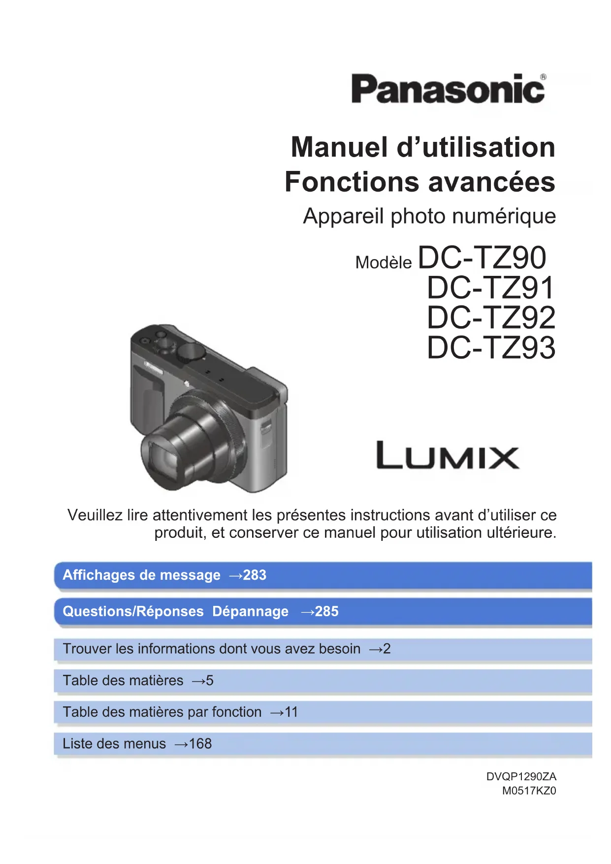 Manuel d’utilisation Fonctions avancées Appareil photo numérique Modèle DC-TZ90 DC-TZ91 DC-TZ92 DC-TZ93 DVQP1290ZAM0517KZ0Affichages de message →283 Veuillez lire attentivement les présentes instructions avant d’utiliser ce produit, et conserver ce manuel pour utilisation ultérieure. Questions/Réponses Dépannage →285Trouver les informations dont vous avez besoin →2Table des matières →5Table des matières par fonction →11Liste des menus →1682 DVQP1290 Trouver les informations dont vous avez besoin Dans ce « Manuel d’utilisation Fonctions avancées », vous trouverez les informations dont vous avez besoin dans les pages suivantes. Cliquer sur un numéro de page vous permet de sauter jusqu’à la page liée et de rapidement trouver les informations. Recherche depuis « Table des matières »