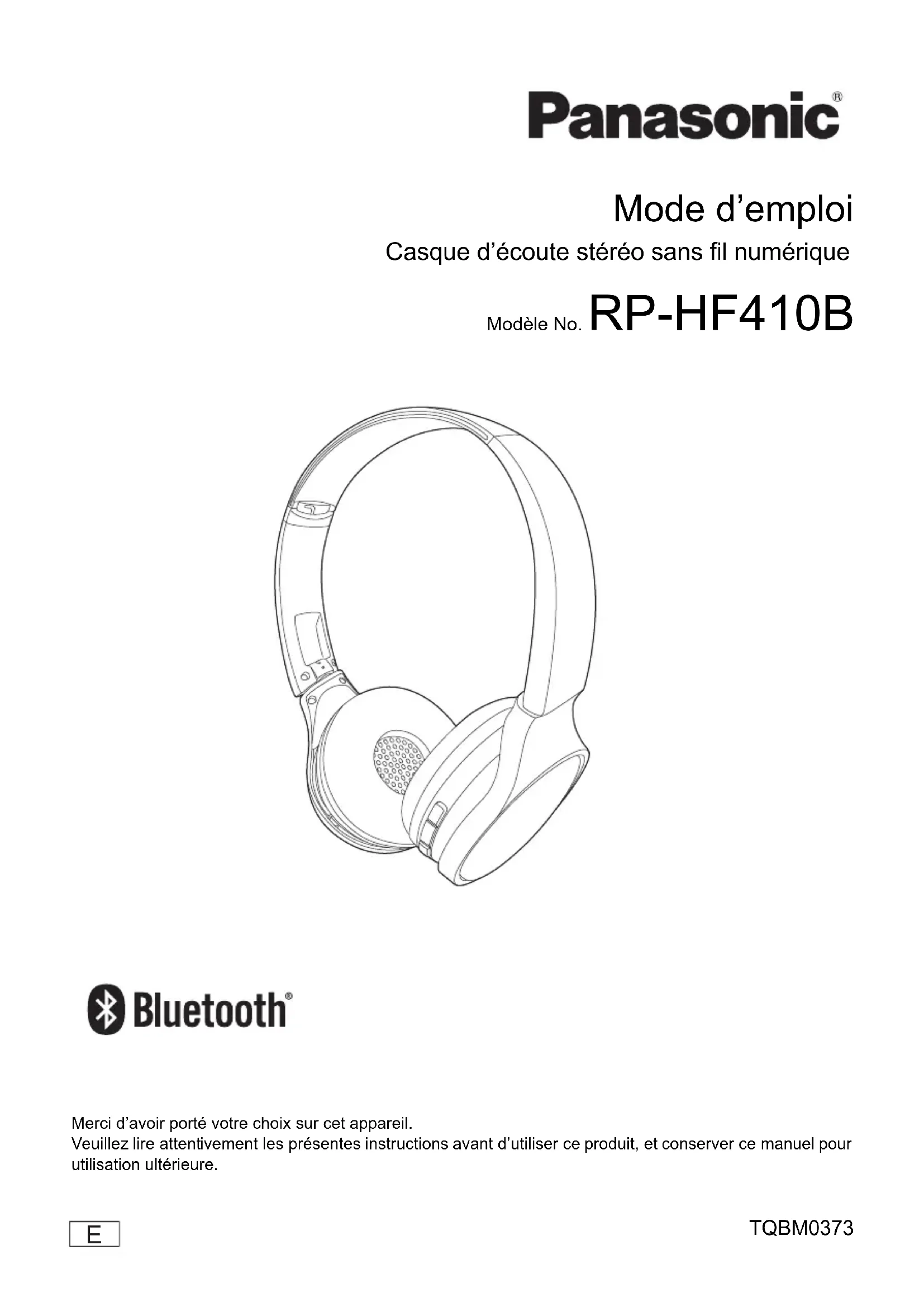 Mode d’emploi Casque d’écoute stéréo sans fil numérique Modèle No. RP-HF410BMerci d’avoir porté votre choix sur cet appareil. Veuillez lire attentivement les présentes instructions avant d’utiliser ce produit, et conserver ce manuel pour utilisation ultérieure. TQBM0373 until 2018/8/112 Précautions de sécurité ∫Appareil