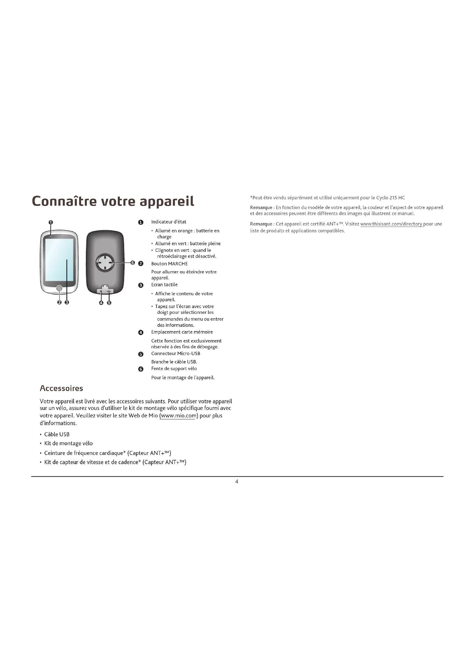 Fente de support vélo Pour le montage de l'appareil. Accessoires Votre appareil est livré avec les accessoires suivants. Pour utiliser votre appareil sur un vélo, assurez vous d’utiliser le kit de montage vélo spécifique fourni avec votre appareil. Veuillez visiter le site Web de Mio (www.mio.com) pour plus d’informations.