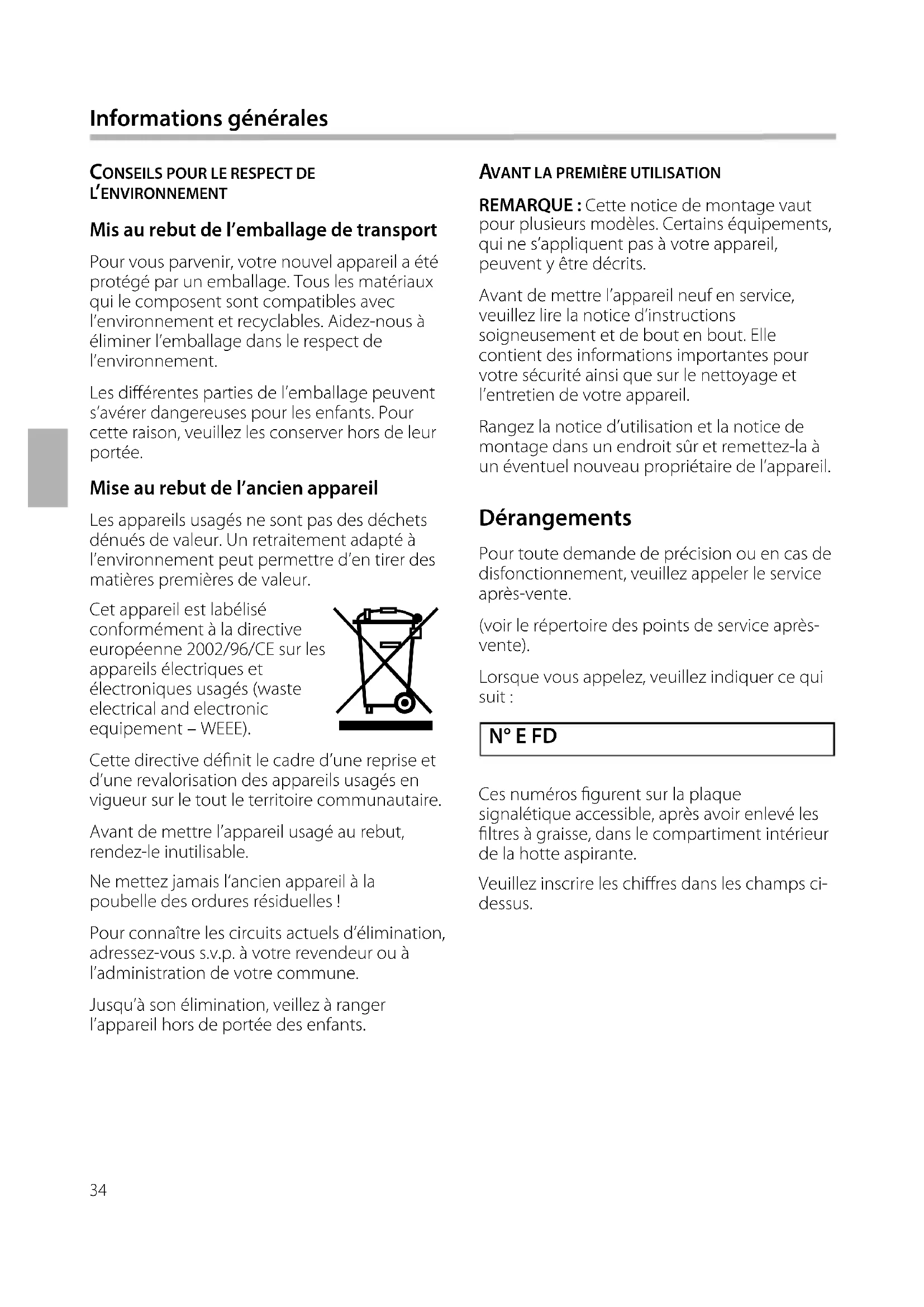’ENVIRONNEMENT Mis au rebut de l’emballage de transport Pour vous parvenir, votre nouvel appareil a été protégé par un emballage. Tous les matériaux qui le composent sont compatibles avec l’environnement et recyclables. Aidez-nous à éliminer l’emballage dans le respect de l’environnement. Les diérentes parties de l’emballage peuvent s’avérer dangereuses pour les enfants. Pour cette raison, veuillez les conserver hors de leur portée. Mise au rebut de l’ancien appareil Les appareils usagés ne sont pas des déchets dénués de valeur. Un retraitement adapté à l’environnement peut permettre d’en tirer des matières premières de valeur. Cet appareil est labélisé conformément à la directive européenne 2002/96/CE sur les appareils électriques et électroniques usagés (waste electrical and electronic equipement – WEEE). Cette directive dénit le cadre d’une reprise et d’une revalorisation des appareils usagés en vigueur sur le tout le territoire communautaire. Avant de mettre l’appareil usagé au rebut, rendez-le inutilisable. Ne mettez jamais l’ancien appareil à la poubelle des ordures résiduelles ! Pour connaître les circuits actuels d’élimination, adressez-vous s.v.p. à votre revendeur ou à l’administration de votre commune. Jusqu’à son élimination, veillez à ranger l’appareil hors de portée des enfants. Dérangements Pour toute demande de précision ou en cas de disfonctionnement, veuillez appeler le service après-vente. (voir le répertoire des points de service après- vente). Lorsque vous appelez, veuillez indiquer ce qui suit : Ces numéros gurent sur la plaque signalétique accessible, après avoir enlevé les ltres à graisse, dans le compartiment intérieur de la hotte aspirante. Veuillez inscrire les chires dans les champs ci- dessus. Informations générales )35 Conformité d’utilisation