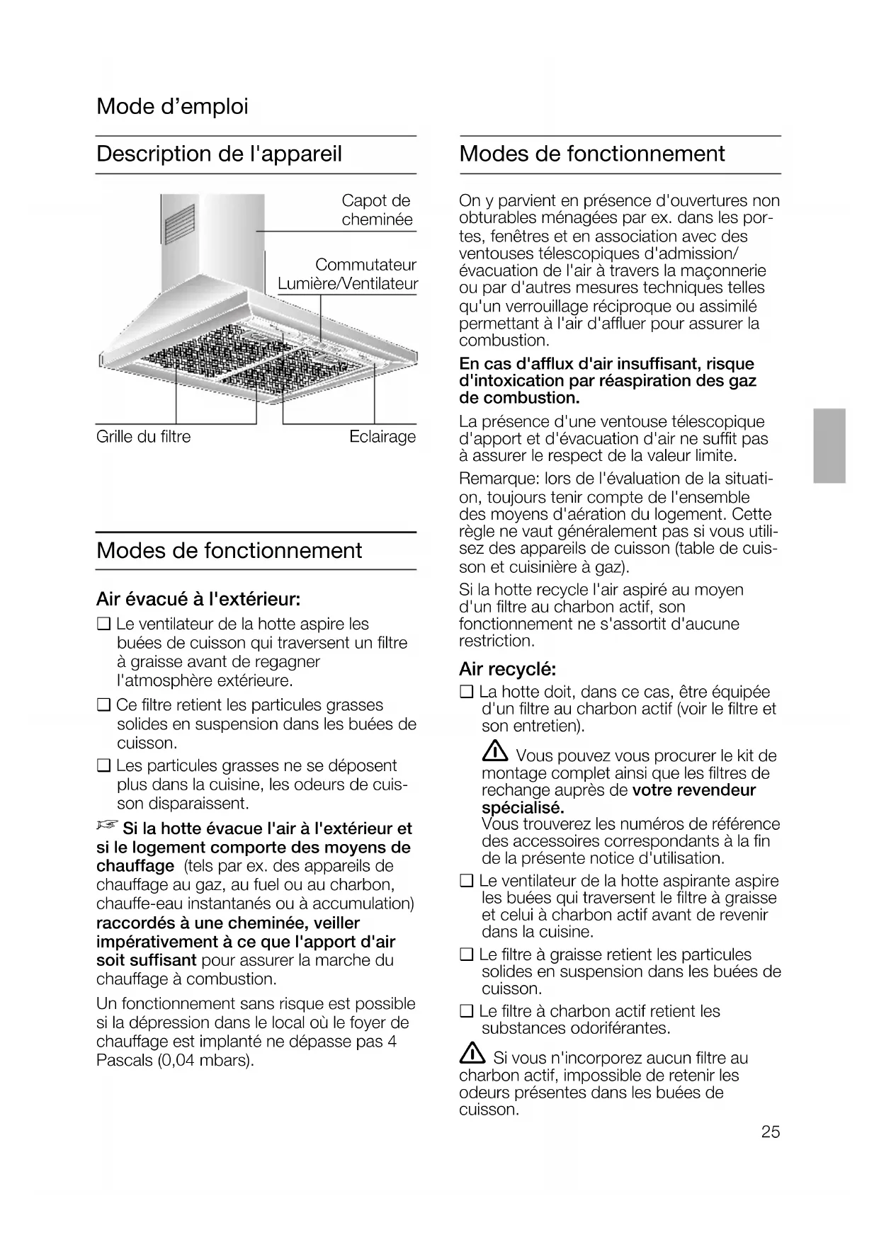 Si la hotte évacue l'air à l'extérieur et si le logement comporte des moyens de chauffage (tels par ex. des appareils de chauffage au gaz, au fuel ou au charbon, chauffe-eau instantanés ou à accumula- tion) raccordés à une cheminée, veiller impérativement à ce que l'apport d'air soit suffisant pour assurer la marche du chauffage à combustion. Un fonctionnement sans risque est possible si la dépression dans le local où le foyer de chauffage est implanté ne dépasse pas 4 Pascals (0,04 mbars). On y parvient en présence d'ouvertures non obturables ménagées par ex. dans les portes, fenêtres et en association avec des ventouses télescopiques d'admission/ évacuation de l'air à travers la maçonnerie ou par d'autres mesures techniques telles qu'un verrouillage réciproque ou assimilé permettant à l'air d'affluer pour assurer la combustion. En cas d'afflux d'air insuffisant, risque d'intoxication par réaspiration des gaz de combustion. La présence d'une ventouse télescopique d'apport et d'évacuation d'air ne suffit pas à assurer le respect de la valeur limite. Remarque: lors de l'évaluation de la situation, toujours tenir compte de l'ensemble des moyens d'aération du logement. Cette règle ne vaut généralement pas si vous utilisez des appareils de cuisson (table de cuisson et cuisinière à gaz). Si la hotte recycle l'air aspiré au moyen d'un filtre au charbon actif, son fonctionnement ne s'assortit d'aucune restriction. Si l'air vicié traverse le mur extérieur, utilisez une ventouse télescopique.