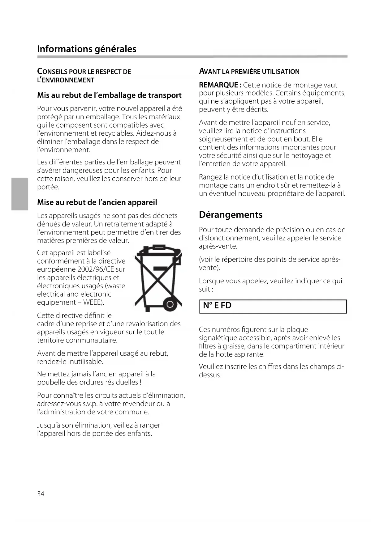 ’ENVIRONNEMENT Mis au rebut de l’emballage de transport Pour vous parvenir, votre nouvel appareil a été protégé par un emballage. Tous les matériaux qui le composent sont compatibles avec l’environnement et recyclables. Aidez-nous à éliminer l’emballage dans le respect de l’environnement. Les diérentes parties de l’emballage peuvent s’avérer dangereuses pour les enfants. Pour cette raison, veuillez les conserver hors de leur portée. Mise au rebut de l’ancien appareil Les appareils usagés ne sont pas des déchets dénués de valeur. Un retraitement adapté à l’environnement peut permettre d’en tirer des matières premières de valeur. Cet appareil est labélisé conformément à la directive européenne 2002/96/CE sur les appareils électriques et électroniques usagés (waste electrical and electronic equipement – WEEE). Cette directive dénit le cadre d’une reprise et d’une revalorisation des appareils usagés en vigueur sur le tout le territoire communautaire. Avant de mettre l’appareil usagé au rebut, rendez-le inutilisable. Ne mettez jamais l’ancien appareil à la poubelle des ordures résiduelles ! Pour connaître les circuits actuels d’élimination, adressez-vous s.v.p. à votre revendeur ou à l’administration de votre commune. Jusqu’à son élimination, veillez à ranger l’appareil hors de portée des enfants. Dérangements Pour toute demande de précision ou en cas de disfonctionnement, veuillez appeler le service après-vente. (voir le répertoire des points de service après- vente). Lorsque vous appelez, veuillez indiquer ce qui suit : Ces numéros gurent sur la plaque signalétique accessible, après avoir enlevé les ltres à graisse, dans le compartiment intérieur de la hotte aspirante. Veuillez inscrire les chires dans les champs ci- dessus. Informations générales35 Conformité d’utilisation
