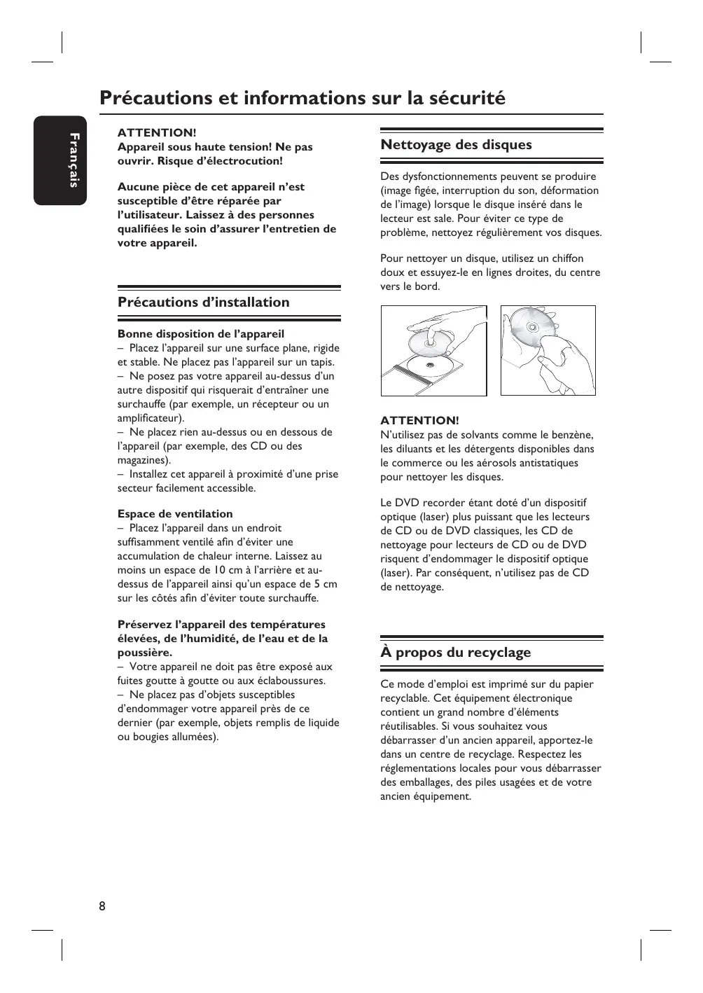 Français Sommaire Précautions et informations sur la sécurité Français ATTENTION! Appareil sous haute tension! Ne pas ouvrir. Risque d’électrocution! Aucune pièce de cet appareil n’est susceptible d’être réparée par l’utilisateur. Laissez à des personnes qualifiées le soin d’assurer l’entretien de votre appareil. Nettoyage des disques Des dysfonctionnements peuvent se produire (image figée, interruption du son, déformation de l’image) lorsque le disque inséré dans le lecteur est sale. Pour éviter ce type de problème, nettoyez régulièrement vos disques. Pour nettoyer un disque, utilisez un chiffon doux et essuyez-le en lignes droites, du centre vers le bord. Précautions d’installation Bonne disposition de l’appareil – Placez l’appareil sur une surface plane, rigide et stable. Ne placez pas l’appareil sur un tapis. – Ne posez pas votre appareil au-dessus d’un autre dispositif qui risquerait d’entraîner une surchauffe (par exemple, un récepteur ou un amplificateur). – Ne placez rien au-dessus ou en dessous de l’appareil (par exemple, des CD ou des magazines). – Installez cet appareil à proximité d’une prise secteur facilement accessible. Espace de ventilation – Placez l’appareil dans un endroit suffisamment ventilé afin d’éviter une accumulation de chaleur interne. Laissez au moins un espace de 10 cm à l’arrière et audessus de l’appareil ainsi qu’un espace de 5 cm sur les côtés afin d’éviter toute surchauffe. Préservez l’appareil des températures élevées, de l’humidité, de l’eau et de la poussière. – Votre appareil ne doit pas être exposé aux fuites goutte à goutte ou aux éclaboussures. – Ne placez pas d’objets susceptibles d’endommager votre appareil près de ce dernier (par exemple, objets remplis de liquide ou bougies allumées).