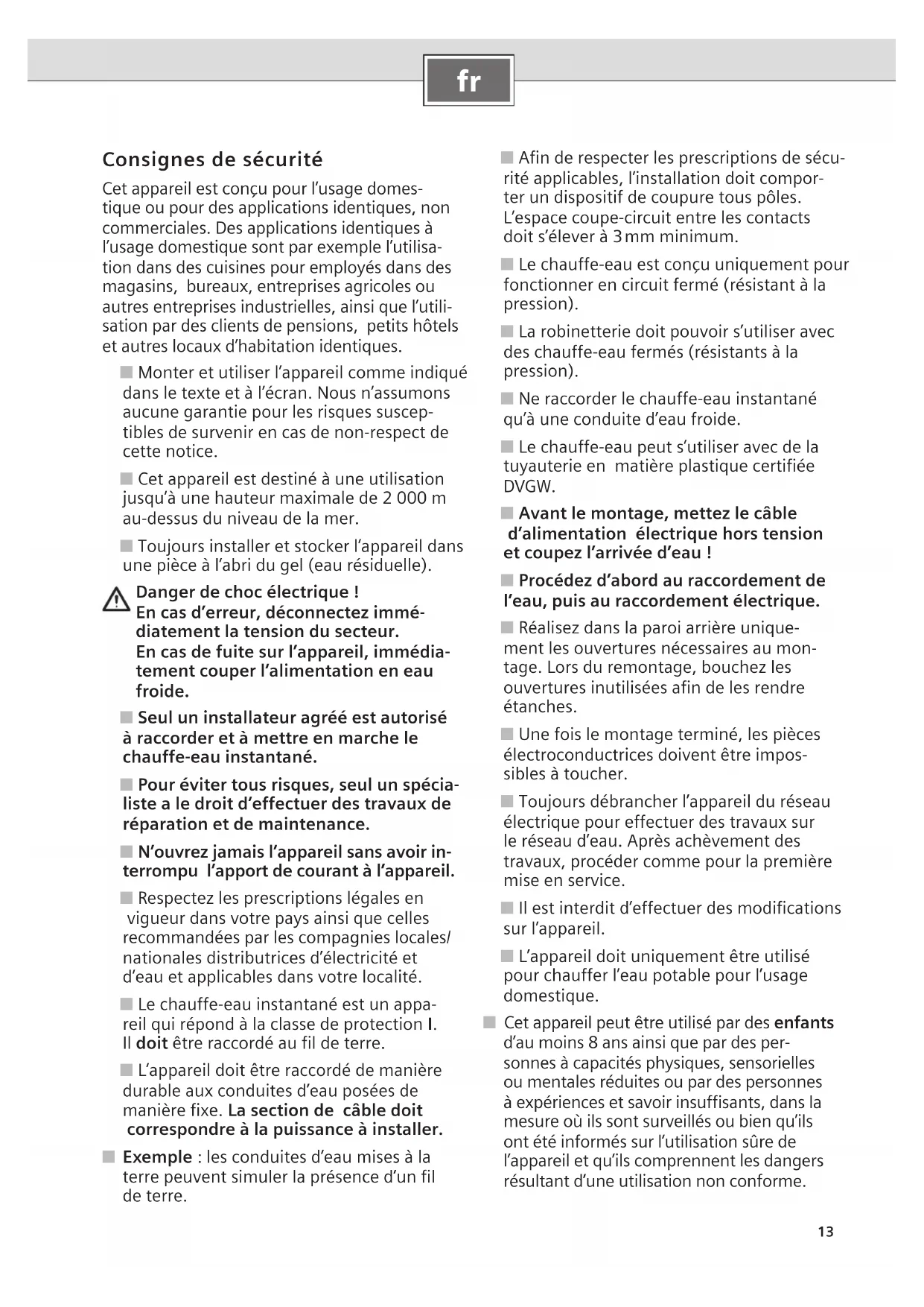 Consignes de sécurité Cet appareil est conçu pour l’usage domes- tique ou pour des applications identiques, non commerciales. Des applications identiques à l’usage domestique sont par exemple l’utilisa- tion dans des cuisines pour employés dans des magasins, bureaux, entreprises agricoles ou autres entreprises industrielles, ainsi que l’utili- sation par des clients de pensions, petits hôtels et autres locaux d’habitation identiques. ■ Monter et utiliser l’appareil comme indiqué dans le texte et à l’écran. Nous n’assumons aucune garantie pour les risques suscep- tibles de survenir en cas de non-respect de cette notice. ■ Cet appareil est destiné à une utilisation jusqu’à une hauteur maximale de 2 000 m au-dessus du niveau de la mer. ■ Toujours installer et stocker l’appareil dans une pièce à l’abri du gel (eau résiduelle). Danger de choc électrique ! En cas d’erreur, déconnectez immé- diatement la tension du secteur. En cas de fuite sur l’appareil, immédia- tement couper l’alimentation en eau froide. ■ Seul un installateur agréé est autorisé à raccorder et à mettre en marche le chauffe-eau instantané. ■ Pour éviter tous risques, seul un spécia- liste a le droit d’effectuer des travaux de réparation et de maintenance. ■ Nʼouvrez jamais l’appareil sans avoir in- terrompu l’apport de courant à l’appareil. ■ Respectez les prescriptions légales en vigueur dans votre pays ainsi que celles recommandées par les compagnies locales/ nationales distributrices d’électricité et d’eau et applicables dans votre localité. ■ Le chauffe-eau instantané est un appa- reil qui répond à la classe de protection I. Il doit être raccordé au fil de terre. ■ L’appareil doit être raccordé de manière durable aux conduites d’eau posées de manière fixe. La section de câble doit correspondre à la puissance à installer. ■ Exemple : les conduites d’eau mises à la terre peuvent simuler la présence d’un fil de terre. ■ Afin de respecter les prescriptions de sécu- rité applicables, l’installation doit compor- ter un dispositif de coupure tous pôles. L’espace coupe-circuit entre les contacts doit s’élever à 3 mm minimum. ■ Le chauffe-eau est conçu uniquement pour fonctionner en circuit fermé (résistant à la pression). ■ La robinetterie doit pouvoir s’utiliser avec des chauffe-eau fermés (résistants à la pression). ■ Ne raccorder le chauffe-eau instantané qu’à une conduite d’eau froide. ■ Le chauffe-eau peut s’utiliser avec de la tuyauterie en matière plastique certifiée DVGW. ■ Avant le montage, mettez le câble d’alimentation électrique hors tension et coupez l’arrivée d’eau ! ■ Procédez d’abord au raccordement de l’eau, puis au raccordement électrique. ■ Réalisez dans la paroi arrière unique- ment les ouvertures nécessaires au mon- tage. Lors du remontage, bouchez les ouvertures inutilisées afin de les rendre étanches. ■ Une fois le montage terminé, les pièces électroconductrices doivent être impos- sibles à toucher. ■ Toujours débrancher l’appareil du réseau électrique pour effectuer des travaux sur le réseau d’eau. Après achèvement des travaux, procéder comme pour la première mise en service. ■ Il est interdit d’effectuer des modifications sur l’appareil. ■ L’appareil doit uniquement être utilisé pour chauffer l’eau potable pour l’usage domestique. ■ Cet appareil peut être utilisé par des enfants d’au moins 8 ans ainsi que par des per- sonnes à capacités physiques, sensorielles ou mentales réduites ou par des personnes à expériences et savoir insuffisants, dans la mesure où ils sont surveillés ou bien qu’ils ont été informés sur l’utilisation sûre de l’appareil et qu’ils comprennent les dangers résultant d’une utilisation non conforme.14