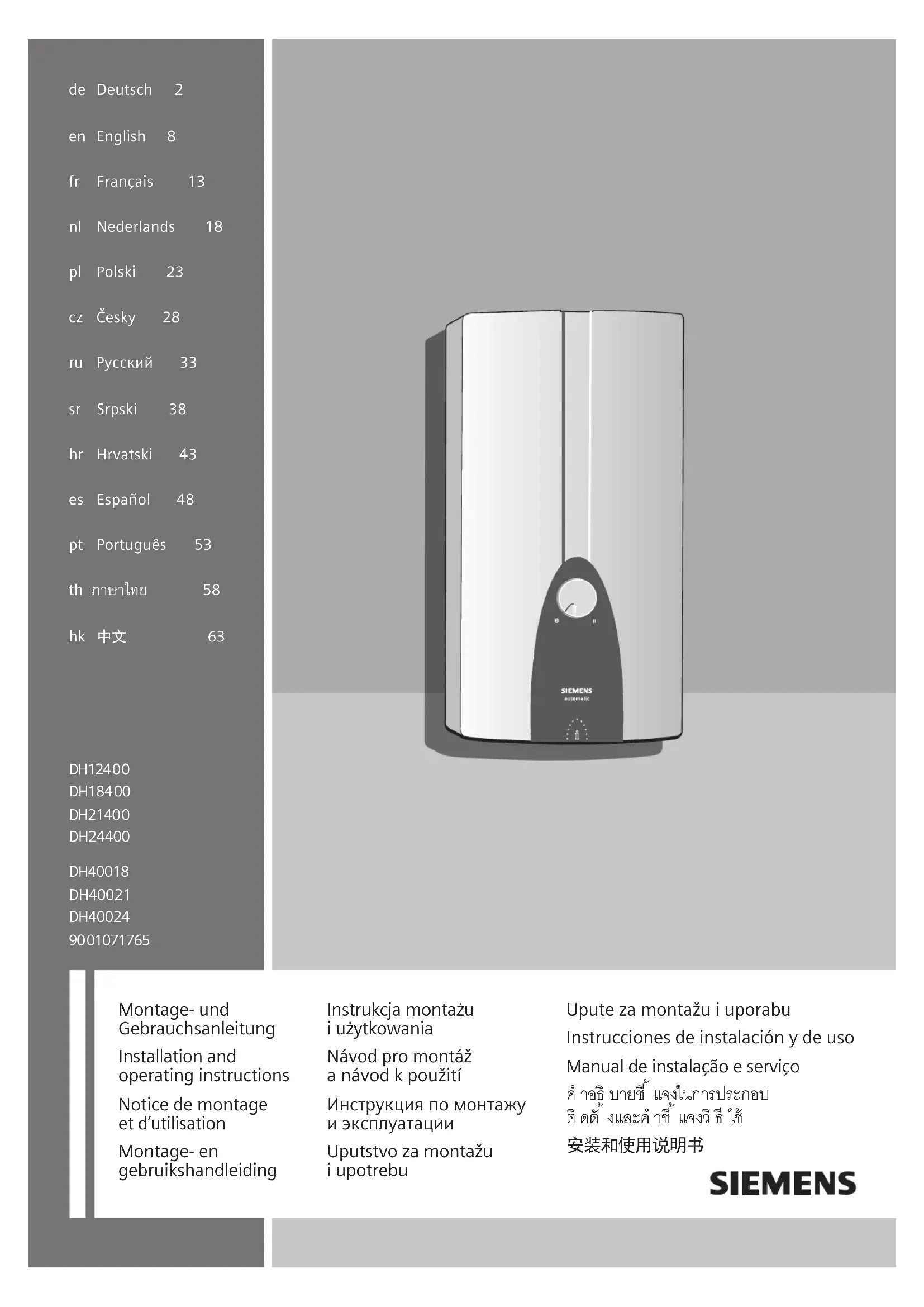 de Deutsch 2 en English 8 fr Français 13 nl Nederlands 18 pl Polski 23 cz Česky 28 ru Русский 33 sr Srpski 38 hr Hrvatski 43 es Español 48 pt Português 53 th ภาษาไทย 58 hk 中文 63 DH12400 DH18400 DH21400 DH24400 DH40018 DH40021 DH40024