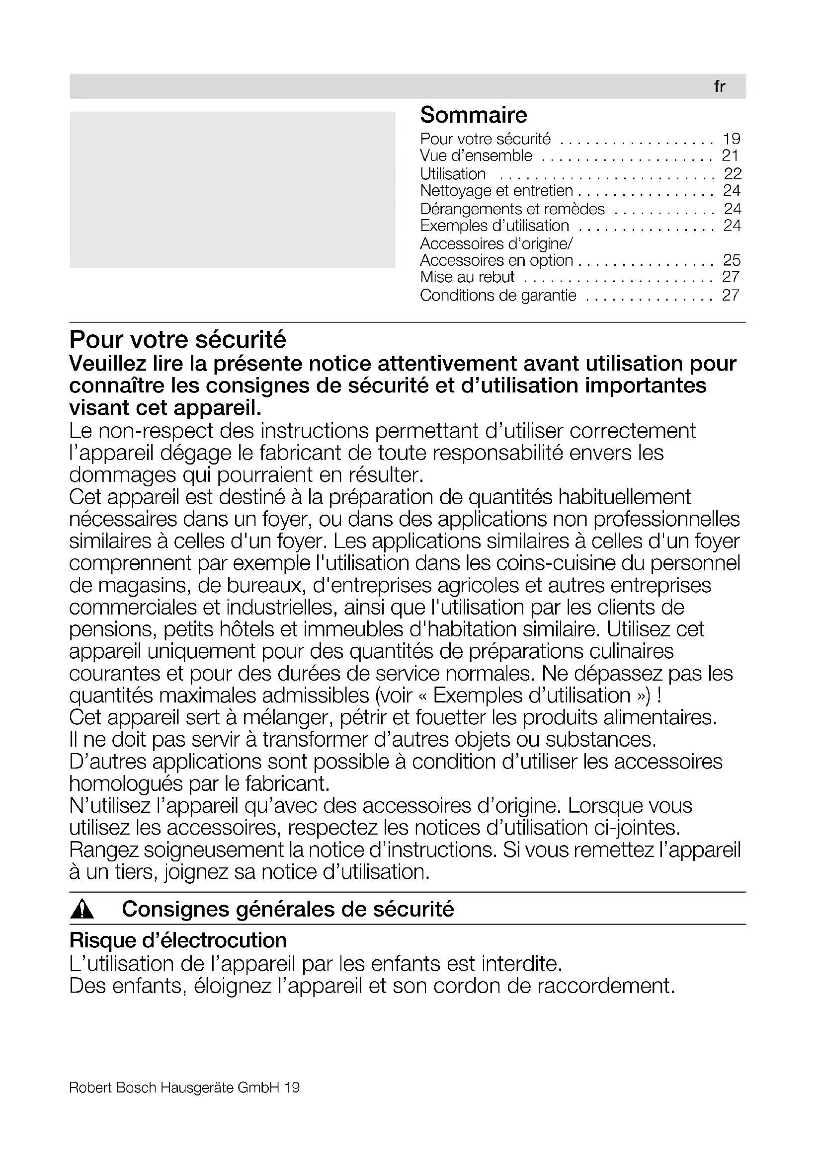 Cet appareil sert à mélanger, pétrir et fouetter les produits alimentaires. Il ne doit pas servir à transformer d'autres objets ou substances.