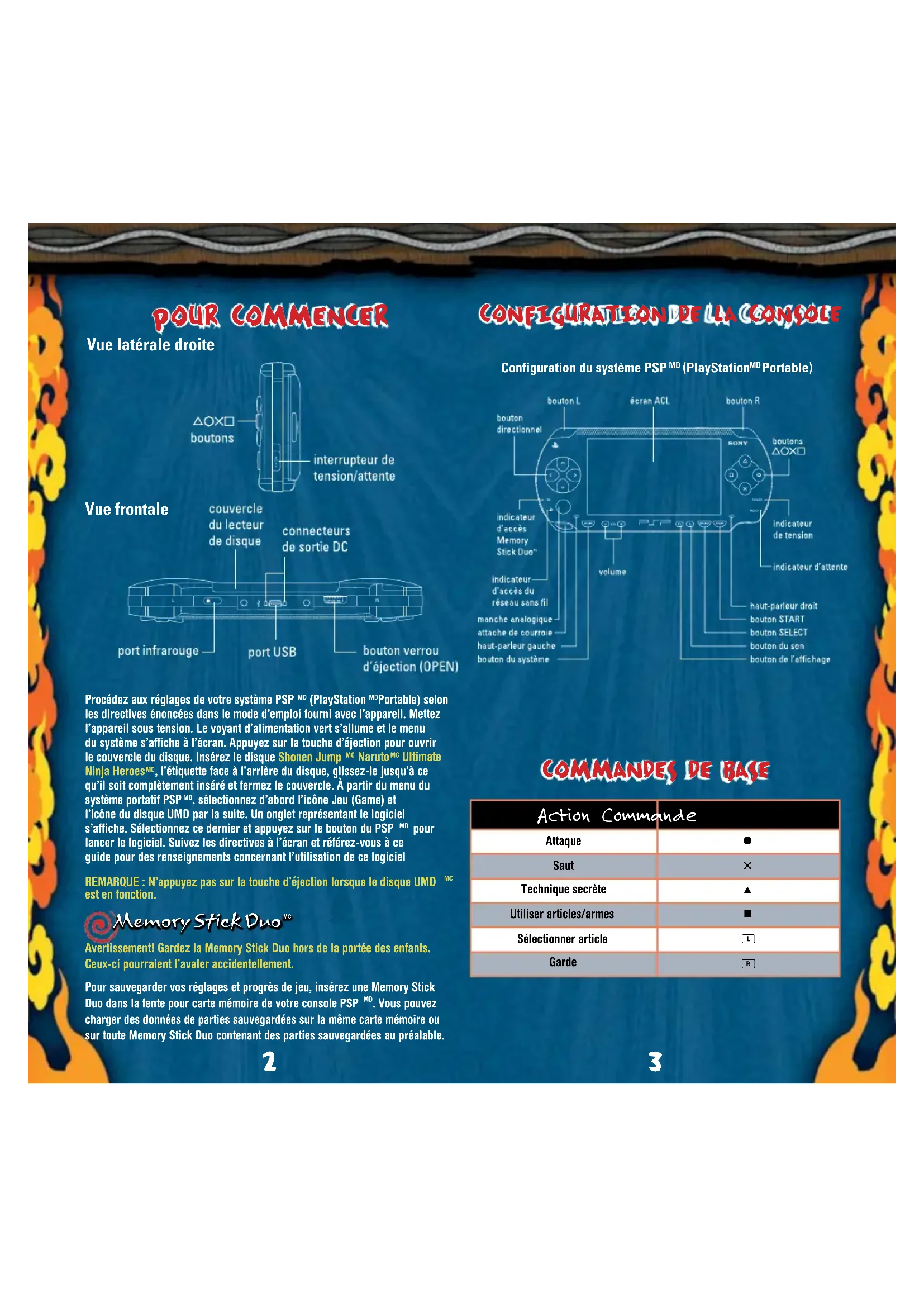 Procedez aux réglages de votre système PSP MD (PlayStation MPortable) selon les directives énoncées dans le mode d'emploi fourni avec l'appareil. Mettez l'appareil sous tension. Levoyant d'alimentation vert s'allume et le menu du système s'affiche à l'écran. Appuyez sur la touche d'éjection pour ouvrir le couvercle du disque. Insérez le disque Shonen Jump MC Naruto MC Ultimate Ninja HeroesMC, l'étiquette face à l'arrière du disque, glissez-le jusqu'à ce qu'il soit complètement inséré et fermez le couvercle. À partir du menu du système portatif PSP MD, Sélectionnez d'abord l'icone Jeu (Game) et l'icone du disque UMD par la suite. Un oranglet représentant le logiciel s'affiche. Sélectionnez ce dernier et appuyez sur le bouton du PSP MD pour lancer le logiciel. Suivez les directives à l'écran et reférer-vous à ce guide pour des renseignements concernant l'utilisation de ce logiciel