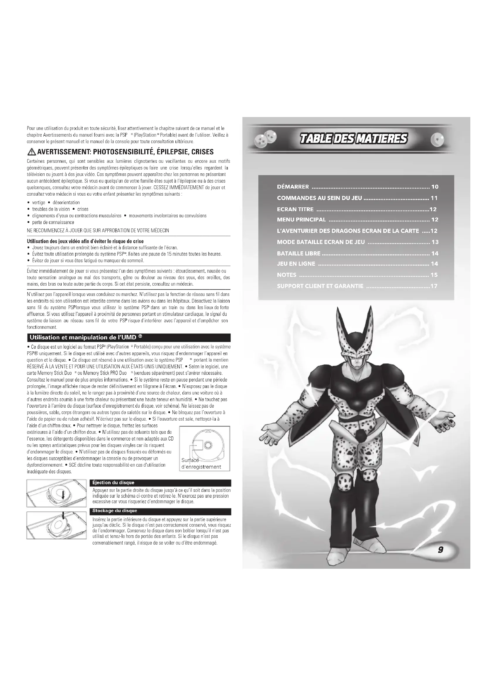 - Ce disque est un logiciel au format PSP (PlayStation Portable) conçu pour une utilisation avec le système PSP® uniquement. Si le disque est utilisé avec d’autres appareils, vous risquez d’endommager l’appareil en question et le disque. • Ce disque est réservé à une utilisation avec le système PSP portant la mention RÉSERVÉ À LA VENTE ET POUR UNE UTILISATION AUX ÉTATS-UNIS UNIQUEMENT. • Selon le logiciel, une carte Memory Stick Duo ou Memory Stick PRO Duo (vendues séparément) peut s’avérer nécessaire. Consultez le manuel pour de plus amples informations. • Si le système reste en pause pendant une période prolongée, l’image affichée risque de rester définitivement en filigrane à l’écran. • N’exposez pas le disque à la lumière directe du soleil, ne le rangez pas à proximité d’une source de chaleur, dans une voiture où à d’autres endroits soumis à une forte chaleur ou présentant une haute teneur en humidité. • Ne touchez pas l’ouverture à l’arrière du disque (surface d’enregistrement du disque, voir schéma). Ne laissez pas de poussières, sable, corps étrangers ou autres types de saletés sur le disque. • Ne bloquez pas l’ouverture à l’aide de papier ou de ruban adhésif. N’écrivez pas sur le disque. • Si l’ouverture est sale, nettoyez-la à l’aide d’un chiffon doux. • Pour nettoyer le disque, frottez les surfaces extérieures à l’aide d’un chiffon doux. • N’utilisez pas de solvants tels que de l’essence, les détergents disponibles dans le commerce et non adaptés aux CD ou les sprays antistatiques prévus pour les disques vinyles car ils risquent d’endommager le disque. • N’utilisez pas de disques fissurés ou déformés ou les disques susceptibles d’endommager la console ou de provoquer un dysfonctionnement. • SCE décline toute responsabilité en cas d'utilisation inadéquate des disques.Surface d’enregistrement Éjection du disque Appuyez sur la partie droite du disque jusqu’à ce qu’il soit dans la position indiquée sur le schéma ci-contre et retirez-le. N’exercez pas une pression excessive car vous risqueriez d’endommager le disque. Stockage du disque Insérez la partie inférieure du disque et appuyez sur la partie supérieure jusqu’au déclic. Si le disque n’est pas correctement conservé, vous risquez de l’endommager. Conservez le disque dans son boîtier lorsqu’il n’est pas utilisé et tenez-le hors de portée des enfants. Si le disque n’est pas convenablement rangé, il risque de se voiler ou d’être endommagé. Certaines personnes, qui sont sensibles aux lumières clignotantes ou vacillantes ou encore aux motifs géométriques, peuvent présenter des symptômes épileptiques ou faire une crise lorsqu’elles regardent la télévision ou jouent à des jeux vidéo. Ces symptômes peuvent apparaître chez les personnes ne présentant aucun antécédent épileptique. Si vous ou quelqu’un de votre famille êtes sujet à l’épilepsie ou à des crises quelconques, consultez votre médecin avant de commencer à jouer. CESSEZ IMMÉDIATEMENT de jouer et consultez votre médecin si vous ou votre enfant présentez les symptômes suivants : • vertige • désorientation• troubles de la vision • crises• clignements d’yeux ou contractions musculaires • mouvements involontaires ou convulsions• perte de connaissance NE RECOMMENCEZ À JOUER QUE SUR APPROBATION DE VOTRE MÉDECIN_______________________________________________________________________________Utilisation des jeux vidéo afin d’éviter le risque de crise• Jouez toujours dans un endroit bien éclairé et à distance suffisante de l'écran.• Évitez toute utilisation prolongée du système PSP . Faites une pause de 15 minutes toutes les heures.• Évitez de jouer si vous êtes fatigué ou manquez de sommeil._______________________________________________________________________________Évitez immédiatement de jouer si vous présentez l’un des symptômes suivants : étourdissement, nausée ou toute sensation analogue au mal des transports, gêne ou douleur au niveau des yeux, des oreilles, des mains, des bras ou toute autre partie du corps. Si cet état persiste, consultez un médecin._______________________________________________________________________________N’utilisez pas l’appareil lorsque vous conduisez ou marchez. N’utilisez pas la fonction de réseau sans fil dans les endroits où son utilisation est interdite comme dans les avions ou dans les hôpitaux. Désactivez la liaison sans fil du système PSP lorsque vous utilisez le système PSP dans un train ou dans les lieux de forte affluence. Si vous utilisez l’appareil à proximité de personnes portant un stimulateur cardiaque, le signal du système de liaison au réseau sans fil de votre PSP risque d’interférer avec l’appareil et d’empêcher son fonctionnement.