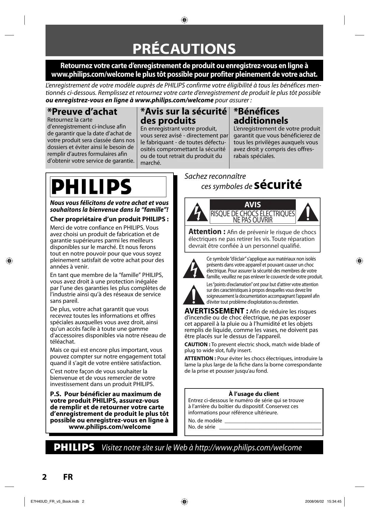 Édition Réglage des fonctions Autres E7H40UD_FR_v5_Book.indb 1 2008/06/02 15:34:41 PRÉCAUTIONS Retournez votre carte d’enregistrement de produit ou enregistrez-vous en ligne à www.philips.com/welcome le plus tôt possible pour profiter pleinement de votre achat. L’enregistrement de votre modèle auprès de PHILIPS confirme votre éligibilité à tous les bénéfices mentionnés ci-dessous. Remplissez et retournez votre carte d’enregistrement de produit le plus tôt possible ou enregistrez-vous en ligne à www.philips.com/welcome pour assurer : *Preuve d’achat Retournez la carte d’enregistrement ci-incluse afin de garantir que la date d’achat de votre produit sera classée dans nos dossiers et éviter ainsi le besoin de remplir d’autres formulaires afin d’obtenir votre service de garantie. *Avis sur la sécurité *Bénéfices des produits additionnels En enregistrant votre produit, vous serez avisé - directement par le fabriquant - de toutes défectuosités compromettant la sécurité ou de tout retrait du produit du marché. L’enregistrement de votre produit garantit que vous bénéficierez de tous les privilèges auxquels vous avez droit y compris des offresrabais spéciales. Sachez reconnaître ces symboles de Nous vous félicitons de votre achat et vous souhaitons la bienvenue dans la “famille”! Cher propriétaire d’un produit PHILIPS : Merci de votre confiance en PHILIPS. Vous avez choisi un produit de fabrication et de garantie supérieures parmi les meilleurs disponibles sur le marché. Et nous ferons tout en notre pouvoir pour que vous soyez pleinement satisfait de votre achat pour des années à venir. En tant que membre de la “famille” PHILIPS, vous avez droit à une protection inégalée par l’une des garanties les plus complètes de l’industrie ainsi qu’à des réseaux de service sans pareil. De plus, votre achat garantit que vous recevrez toutes les informations et offres spéciales auxquelles vous avez droit, ainsi qu’un accès facile à toute une gamme d’accessoires disponibles via notre réseau de téléachat. Mais ce qui est encore plus important, vous pouvez compter sur notre engagement total quand il s’agit de votre entière satisfaction. C’est notre façon de vous souhaiter la bienvenue et de vous remercier de votre investissement dans un produit PHILIPS. P.S. Pour bénéficier au maximum de votre produit PHILIPS, assurez-vous de remplir et de retourner votre carte d’enregistrement de produit le plus tôt possible ou enregistrez-vous en ligne à www.philips.com/welcome sécurité AVIS