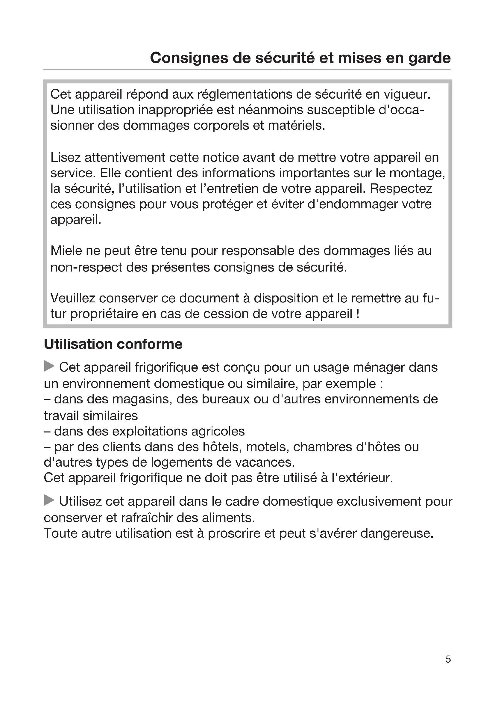 Cet appareil répond aux réglementations de sécurité en vigueur. Une utilisation inappropriée est néanmoins susceptible d'occa- sionner des dommages corporels et matériels. Lisez attentivement cette notice avant de mettre votre appareil en service. Elle contient des informations importantes sur le montage, la sécurité, l’utilisation et l’entretien de votre appareil. Respectez ces consignes pour vous protéger et éviter d'endommager votre appareil. Miele ne peut être tenu pour responsable des dommages liés au non-respect des présentes consignes de sécurité. Veuillez conserver ce document à disposition et le remettre au fu- tur propriétaire en cas de cession de votre appareil! Utilisation conforme Cet appareil frigorifique est conçu pour un usage ménager dans un environnement domestique ou similaire, par exemple: – dans des magasins, des bureaux ou d'autres environnements de travail similaires – dans des exploitations agricoles – par des clients dans des hôtels, motels, chambres d'hôtes ou d'autres types de logements de vacances. Cet appareil frigorifique ne doit pas être utilisé à l'extérieur. Utilisez cet appareil dans le cadre domestique exclusivement pour conserver et rafraîchir des aliments. Toute autre utilisation est à proscrire et peut s'avérer dangereuse.Consignes de sécurité et mises en garde