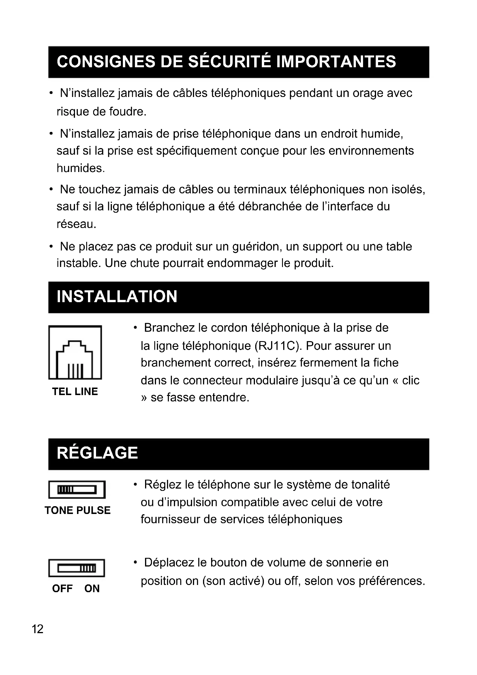 - N’installez jamais de prise téléphonique dans un endroit humide, sauf si la prise est spéciquement conçue pour les environnements humides.