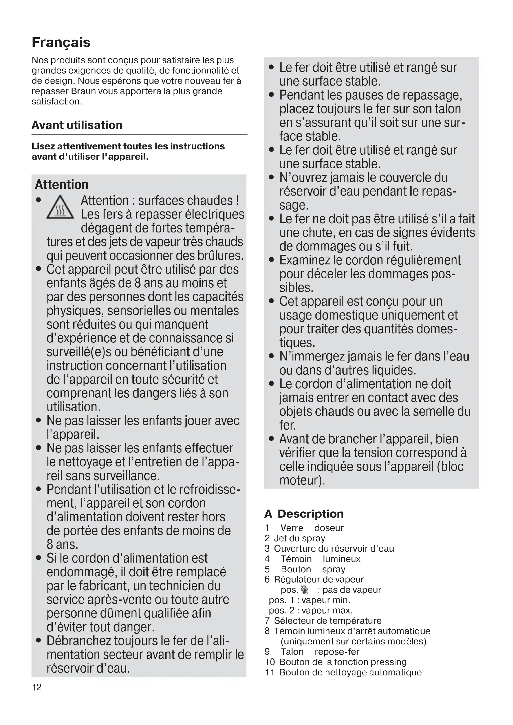 Register now at www.braunhousehold.co.uk By registering we may send you from time to time details on exclusive offers, promotions, recipes and inside tips. 1271015IDL_TS_345-355A_S6-64.indd 11 13.05.15 14:3112 Nos produits sont conçus pour satisfaire les plus grandes exigences de qualité, de fonctionnalité et de design. Nous espérons que votre nouveau fer à repasser Braun vous apportera la plus grande satisfaction. Avant utilisation Lisez attentivement toutes les instructions avant d’utiliser l’appareil. Attention