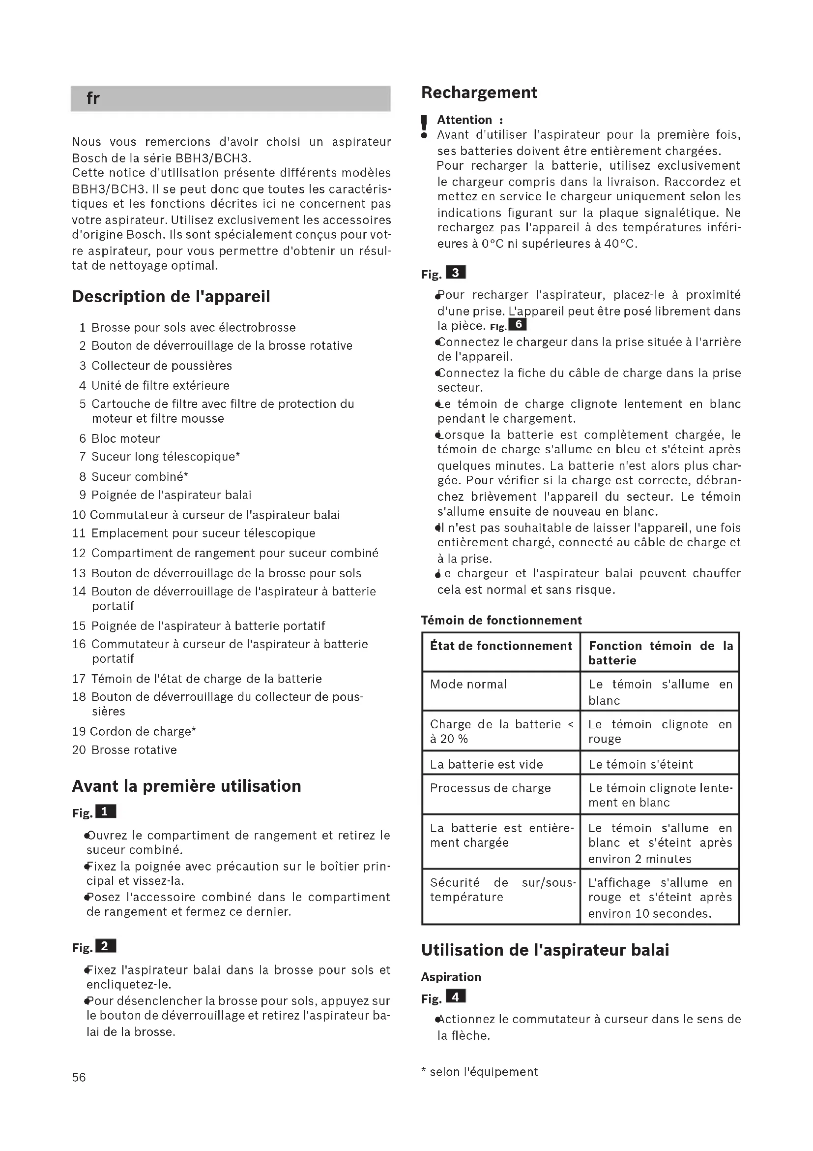 Nous vous remercions d'avoir choisi un aspirateur Bosch de la série BBH3/BCH3. Cette notice d'utilisation présente différents modèle s BBH3/BCH3. Il se peut donc que toutes les caractéris- tiques et les fonctions décrites ici ne concernent pas votre aspirateur. Utilisez exclusivement les accessoires d'origine Bosch. Ils sont spécialement conçus pour vot- re aspirateur, pour vous permettre d'obtenir un résul- tat de nettoyage optim al. Description de l'appareil 1 Brosse pour sols avec électrobrosse 2 Bouton de déverrouillage de la brosse rotative 3 Collecteur de poussières 4 Unité de filtre extérieure 5 Cartouche de filtre avec filtre de protection du moteur et filtre mousse 6 Bloc moteur 7 Suceur long télescopique* 8 Suceur combiné* 9 Poignée de l'aspirateur balai 10 Commutat eur à curseur de l'aspirateur balai 11 Emplacement pour suceur télescopique 12 Compartiment de rangement pour suceur combiné 13 Bouton de déverrouillage de la brosse pour sols 14 Bouton de déverrouillage de l'aspirateur à batterie portatif 15 Poignée de l'aspirateur à batterie portatif 16 Commutateur à curseur de l'aspirateur à batterie portatif 17 Témoin de l'état de charge de la batterie 18 Bouton de déverrouillage du collecteur de pous- sières 19 Cordon de charge* 20 Brosse rotative Avant la première utilisation Fig.