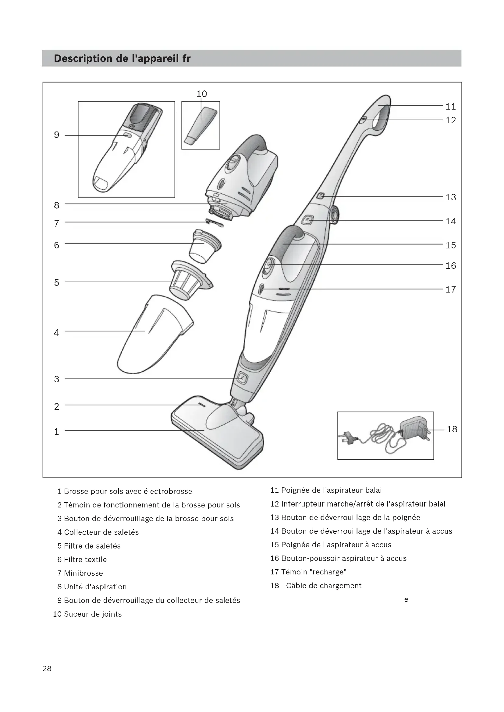 1 Brosse pour sols avec électrobrosse 2 Témoin de fonctionnement de la brosse pour sols 3 Bouton de déverrouillage de la brosse pour sols 4 Collecteur de saletés 5 Filtre de saletés 6 Filtre textile 7 Minibrosse 8 Unité d'aspiration 9 Bouton de déverrouillage du collecteur de saletés 10 Suceur de joints 11 Poignée de l'aspirateur balai 12 Interrupteur marche/arrêt de l'aspirateur balai 13 Bouton de déverrouillage de la poignée 14 Bouton de déverrouillage de l'aspirateur à accus 15 Poignée de l'aspirateur à accus 16 Bouton-poussoir aspirateur à accus 17 Témoin "recharge" 18 Station de charge 19 Support de base station de charge 20 Câble de chargement Câble de chargement Description de l'appareil fr29