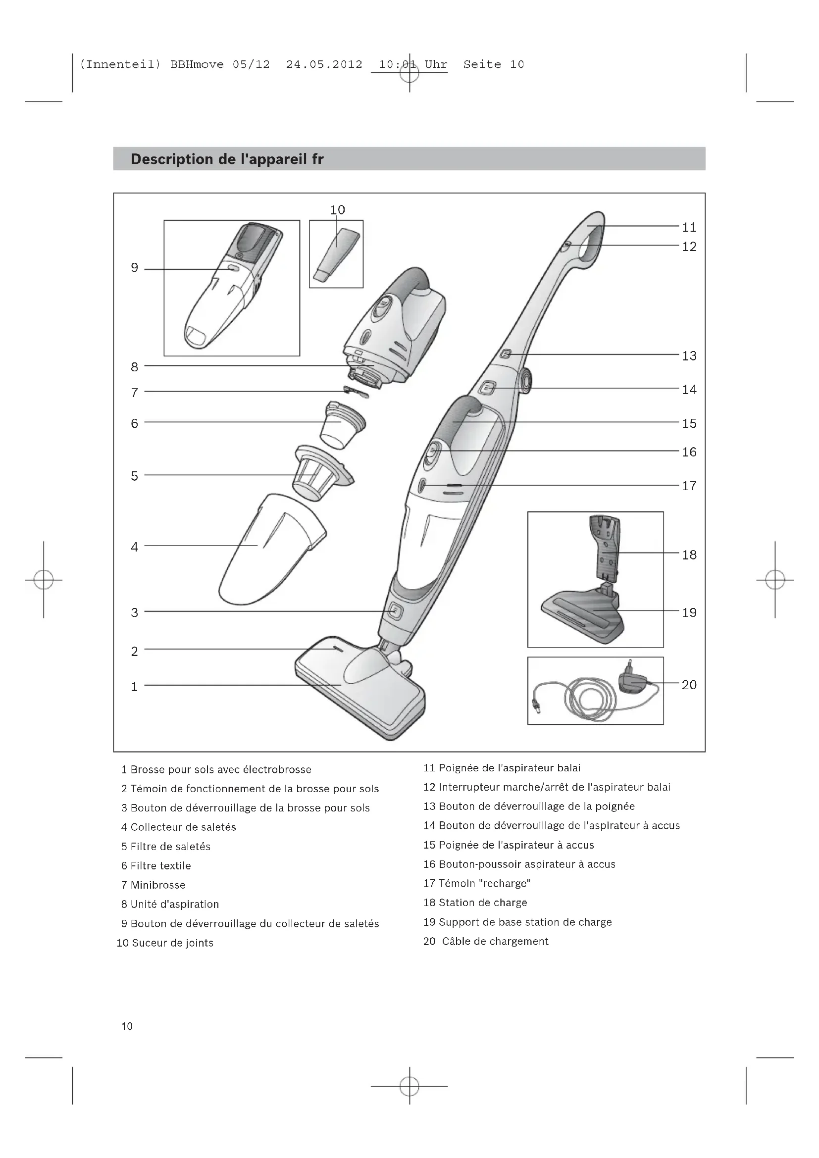 (Innenteil) BBHmove 05/12 24.05.2012 10:01 Uhr Seite 910 Description de l'appareil fr 1 Brosse pour sols avec électrobrosse 2 Témoin de fonctionnement de la brosse pour sols 3 Bouton de déverrouillage de la brosse pour sols 4 Collecteur de saletés 5 Filtre de saletés 6 Filtre textile 7 Minibrosse 8 Unité d'aspiration 9 Bouton de déverrouillage du collecteur de saletés 10 Suceur de joints 11 Poignée de l'aspirateur balai 12 Interrupteur marche/arrêt de l'aspirateur balai 13 Bouton de déverrouillage de la poignée 14 Bouton de déverrouillage de l'aspirateur à accus 15 Poignée de l'aspirateur à accus 16 Bouton-poussoir aspirateur à accus 17 Témoin "recharge" 18 Station de charge 19 Support de base station de charge 20 Câble de chargement