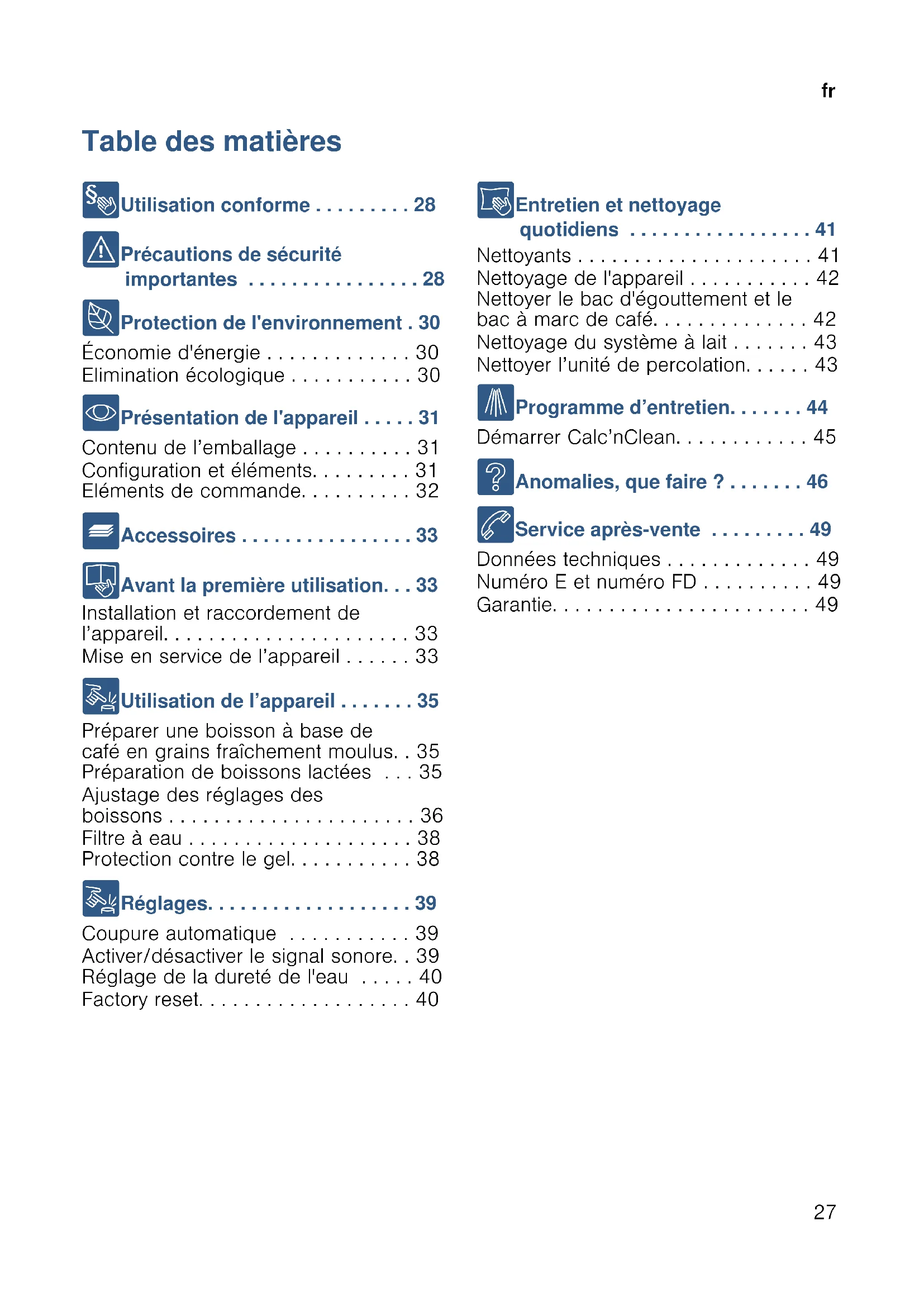 - Présentation de l'appareil . . . . . 31 Contenu de l’emballage . . . . . . . . . . 31 Configuration et éléments. . . . . . . . . 31 Eléments de commande. . . . . . . . . . 32 _ Accessoires . . . . . . . . . . . . . . . . 33 K Avant la première utilisation. . . 33 Installation et raccordement de l’appareil. . . . . . . . . . . . . . . . . . . . . . 33 Mise en service de l’appareil . . . . . . 33 1 Utilisation de l’appareil . . . . . . . 35 Préparer une boisson à base de café en grains fraîchement moulus. . 35 Préparation de boissons lactées . . . 35 Ajustage des réglages des boissons . . . . . . . . . . . . . . . . . . . . . . 36 Filtre à eau . . . . . . . . . . . . . . . . . . . . 38 Protection contre le gel. . . . . . . . . . . 38 1 Réglages. . . . . . . . . . . . . . . . . . . 39 Coupure automatique . . . . . . . . . . . 39 Activer/désactiver le signal sonore. . 39 Réglage de la dureté de l'eau . . . . . 40 Factory reset. . . . . . . . . . . . . . . . . . . 40 D Entretien et nettoyage quotidiens . . . . . . . . . . . . . . . . . 41 Nettoyants . . . . . . . . . . . . . . . . . . . . . 41 Nettoyage de l'appareil . . . . . . . . . . . 42 Nettoyer le bac d'égouttement et le bac à marc de café. . . . . . . . . . . . . . 42 Nettoyage du système à lait . . . . . . . 43 Nettoyer l’unité de percolation. . . . . . 43 . Programme d’entretien. . . . . . . 44 Démarrer Calc’nClean. . . . . . . . . . . . 45 3 Anomalies, que faire ? . . . . . . . 46 4 Service après-vente . . . . . . . . . 49 Données techniques . . . . . . . . . . . . . 49 Numéro E et numéro FD . . . . . . . . . . 49 Garantie. . . . . . . . . . . . . . . . . . . . . . . 49fr Utilisation conforme