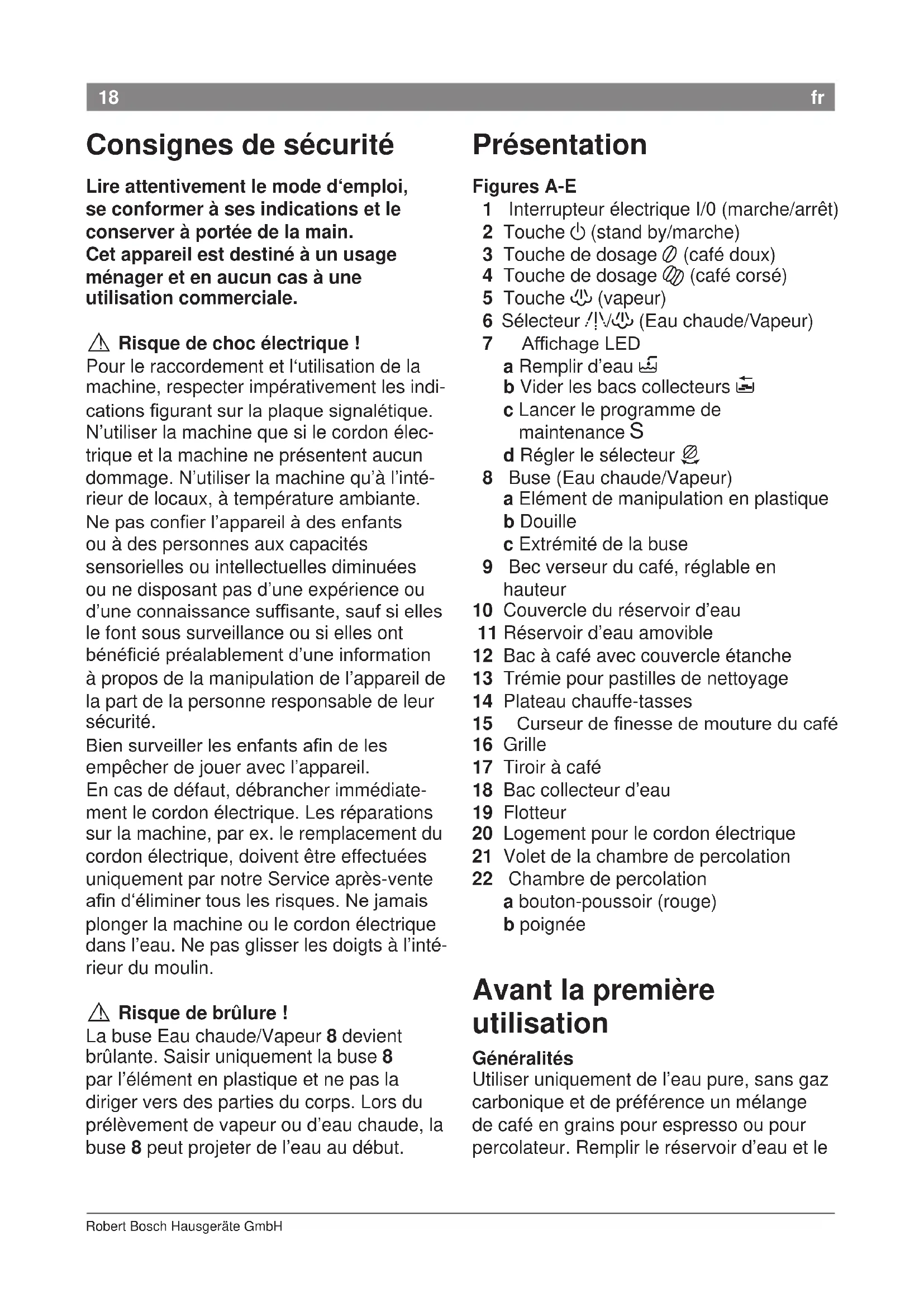 ! Risque de brûlure ! La buse Eau chaude/Vapeur 8 devient brûlante. Saisir uniquement la buse 8 par l’élément en plastique et ne pas la diriger vers des parties du corps. Lors du prélèvement de vapeur ou d’eau chaude, la buse 8 peut projeter de l’eau au début. Présentation Figures A-E 1 Interrupteur électrique I/0 (marche/arrêt) 2 Touche a (stand by/marche) 3 Touche de dosage 5 (café doux) 4 Touche de dosage K (café corsé) 5 Touche h (vapeur) 6 Sélecteur g/h (Eau chaude/Vapeur) 7 AfchageLED a Remplir d’eau H b Vider les bacs collecteurs I c Lancer le programme de maintenance S d Régler le sélecteur J 8 Buse (Eau chaude/Vapeur) a Elément de manipulation en plastique b Douille c Extrémité de la buse 9 Bec verseur du café, réglable en hauteur 10 Couvercle du réservoir d’eau 11 Réservoir d’eau amovible 12 Bac à café avec couvercle étanche 13 Trémie pour pastilles de nettoyage 14 Plateau chauffe-tasses 15 Curseurdenessedemoutureducafé 16 Grille 17 Tiroir à café 18 Bac collecteur d’eau 19 Flotteur 20 Logement pour le cordon électrique 21 Volet de la chambre de percolation 22 Chambre de percolation a bouton-poussoir (rouge) b poignée Avant la première utilisation Généralités Utiliser uniquement de l’eau pure, sans gaz carbonique et de préférence un mélange de café en grains pour espresso ou pour percolateur. Remplir le réservoir d’eau et le19 TCA52 09/2007