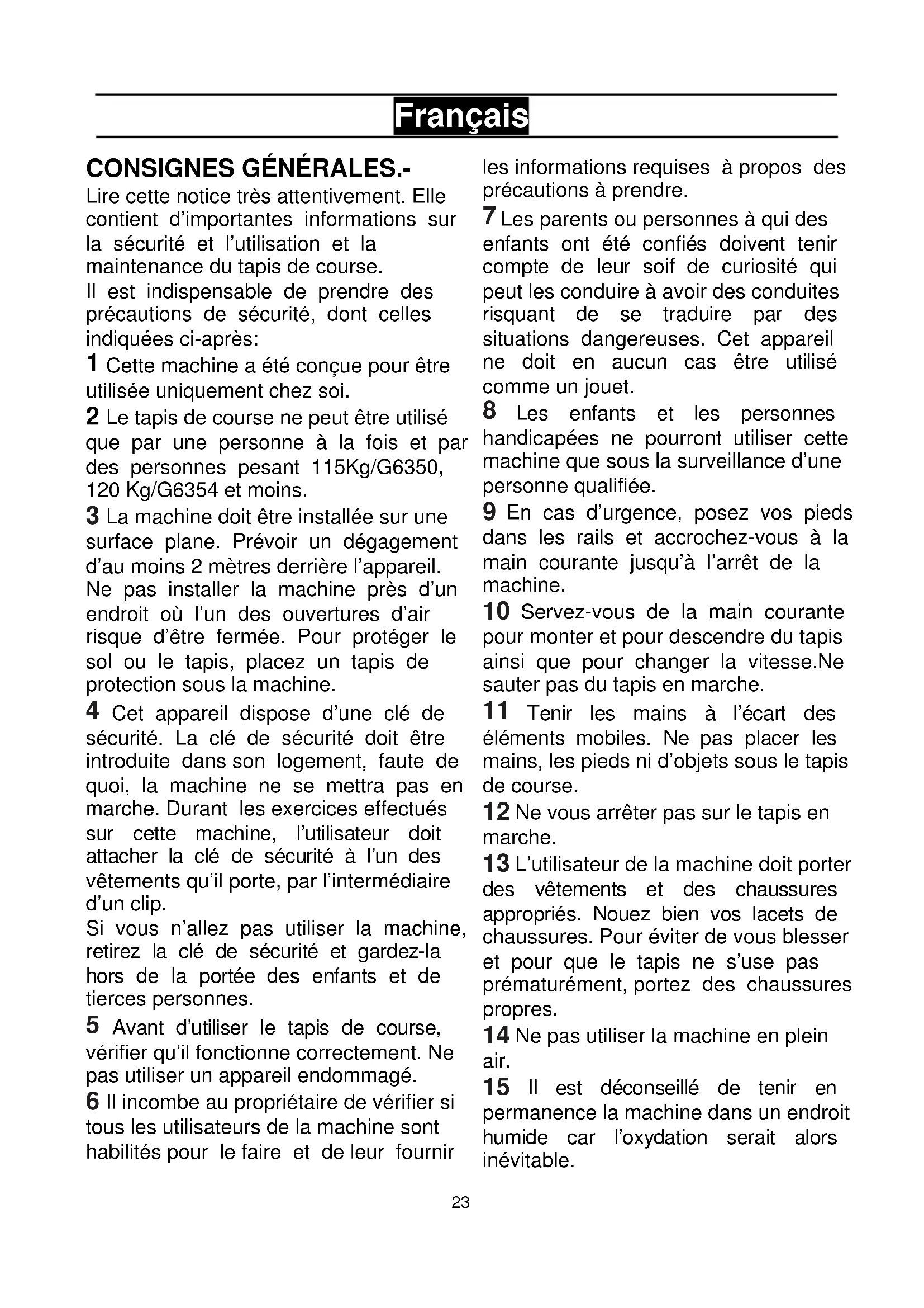2 Le tapis de course ne peut et être utilisé que par une personne à la fois et par des personnes pesant 115Kg/G6350, 120 Kg/G6354 et moins.