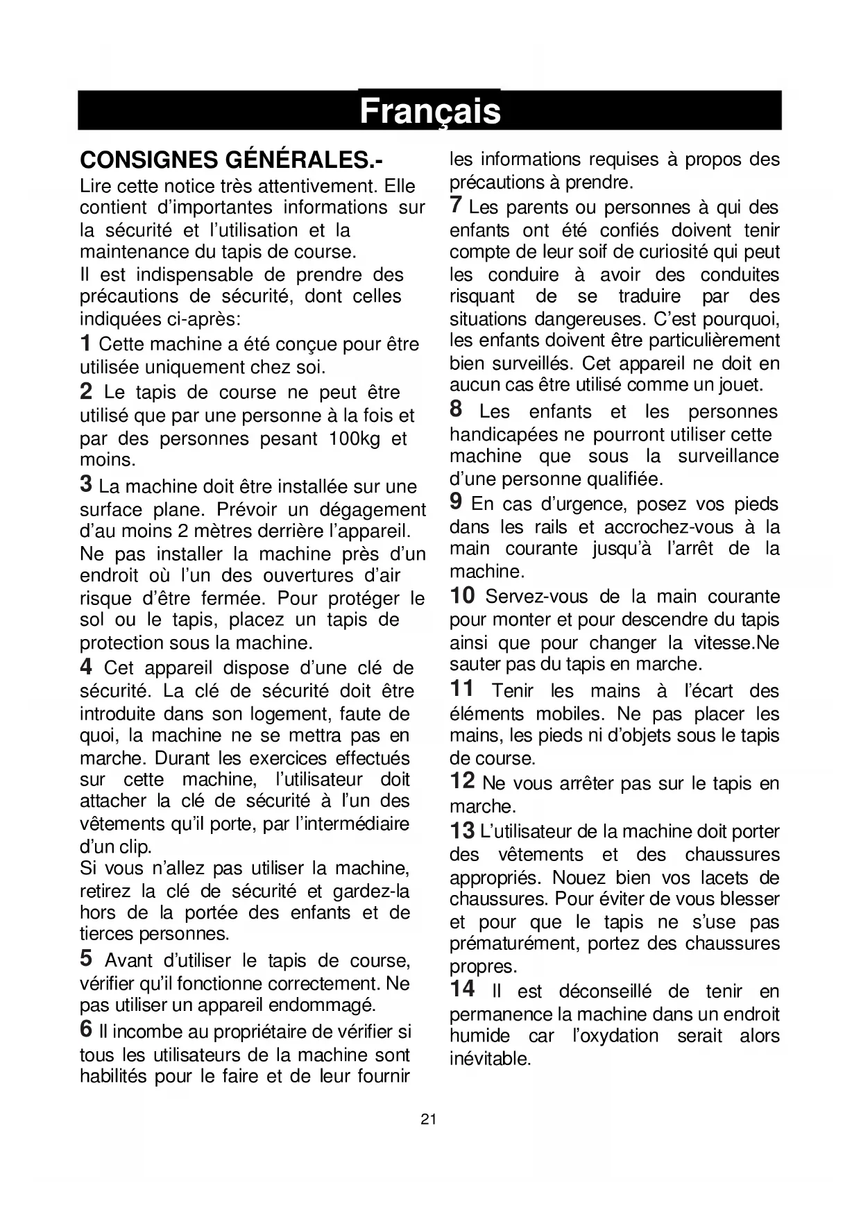 2 Le tapis de course ne peut etre utilise que par une personne a la fois et par des personnes pesant 100kg et moins.