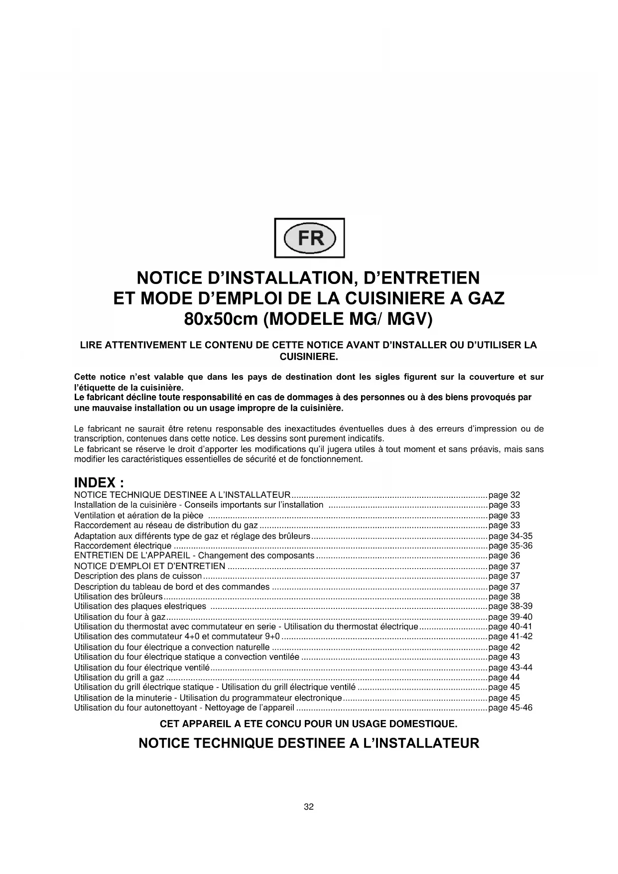 ET MODE D’EMPLOI DE LA CUISINIERE A GAZ 80x50cm (MODELE MG/ MGV) LIRE ATTENTIVEMENT LE CONTENU DE CETTE NOTICE AVANT D’INSTALLER OU D’UTILISER LA CUISINIERE. Cette notice n’est valable que dans les pays de destination dont les sigles figurent sur la couverture et sur l’étiquette de la cuisinière. Le fabricant décline toute responsabilité en cas de dommages à des personnes ou à des biens provoqués par une mauvaise installation ou un usage impropre de la cuisinière. Le fabricant ne saurait être retenu responsable des inexactitudes éventuelles dues à des erreurs d’impression ou de transcription, contenues dans cette notice. Les dessins sont purement indicatifs. Le fabricant se réserve le droit d’apporter les modifications qu’il jugera utiles à tout moment et sans préavis, mais sans modifier les caractéristiques essentielles de sécurité et de fonctionnement. INDEX : NOTICE TECHNIQUE DESTINEE A L’INSTALLATEUR ................................................................................ page 32 Installation de la cuisinière - Conseils importants sur l’installation ................................................................. page 33 Ventilation et aération de la pièce .................................................................................................................. page 33 Raccordement au réseau de distribution du gaz ............................................................................................. page 33 Adaptation aux différents type de gaz et réglage des brûleurs ........................................................................ page 34-35 Raccordement électrique ................................................................................................................................ page 35-36 ENTRETIEN DE L'APPAREIL - Changement des composants ...................................................................... page 36 NOTICE D’EMPLOI ET D’ENTRETIEN .......................................................................................................... page 37 Description des plans de cuisson .................................................................................................................... page 37 Description du tableau de bord et des commandes ........................................................................................ page 37 Utilisation des brûleurs .................................................................................................................................... page 38 Utilisation des plaques elestriques ................................................................................................................. page 38-39 Utilisation du four à gaz ................................................................................................................................... page 39-40 Utilisation du thermostat avec commutateur en serie - Utilisation du thermostat électrique ............................ page 40-41 Utilisation des commutateur 4+0 et commutateur 9+0 .................................................................................... page 41-42 Utilisation du four électrique a convection naturelle ........................................................................................ page 42 Utilisation du four électrique statique a convection ventilée ............................................................................ page 43 Utilisation du four électrique ventilé ................................................................................................................. page 43-44 Utilisation du grill a gaz ................................................................................................................................... page 44 Utilisation du grill électrique statique - Utilisation du grill électrique ventilé ..................................................... page 45 Utilisation de la minuterie - Utilisation du programmateur electronique ........................................................... page 45 Utilisation du four autonettoyant - Nettoyage de l’appareil .............................................................................. page 45-46 CET APPAREIL A ETE CONCU POUR UN USAGE DOMESTIQUE.