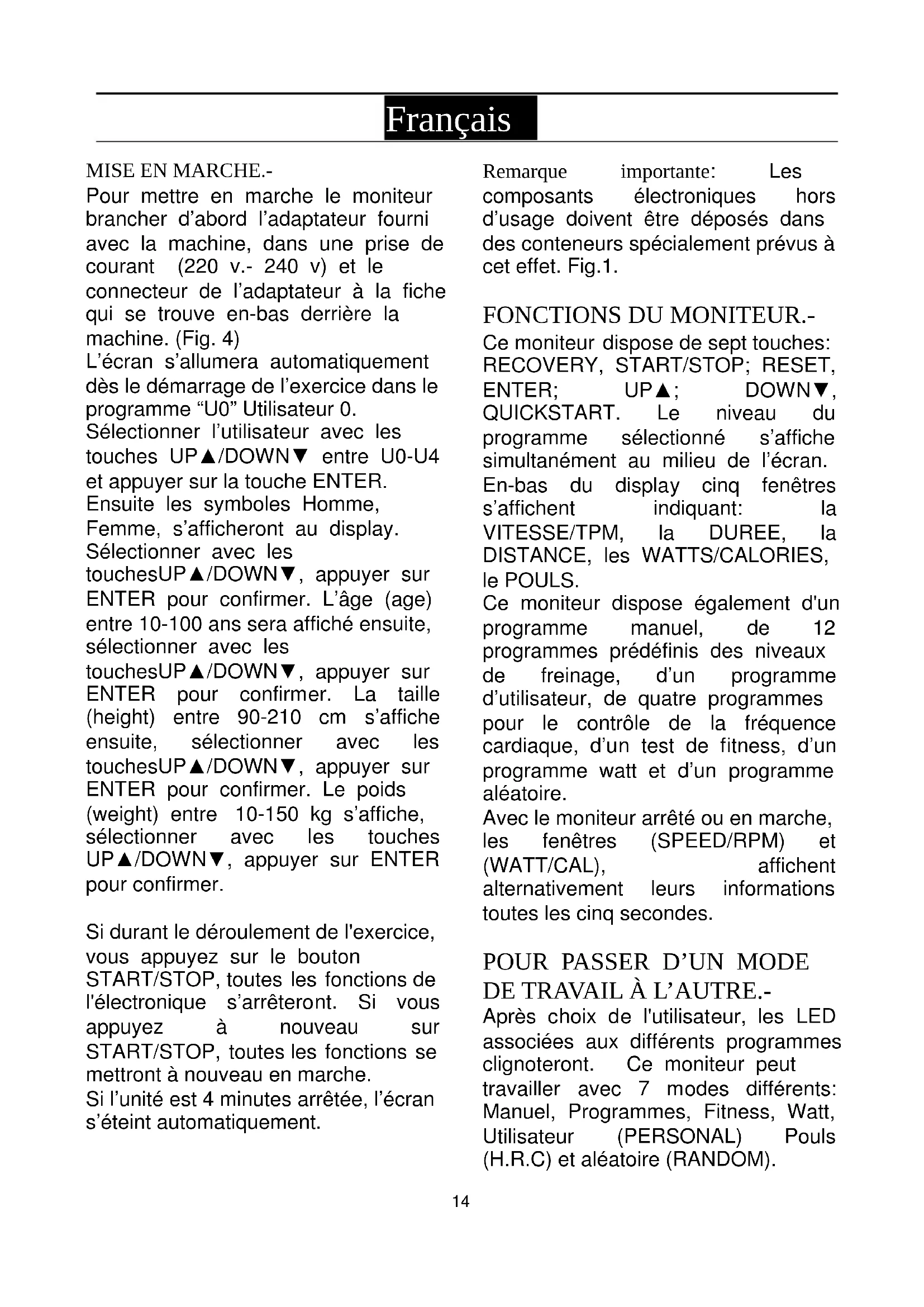 Ce moniteur dispose de sept touches: RECOVERY, START/STOP; RESET, ENTER; UP▲; DOWN▼, QUICKSTART. Le niveau du programme sélectionné s'affiche simultanément au milieu de l'écran. En-bas du display cinq fenêtres s'affichent indiquant: la VITESSE/TPM, la DUREE, la DISTANCE, les WATTS/CALORIES, le POULS.