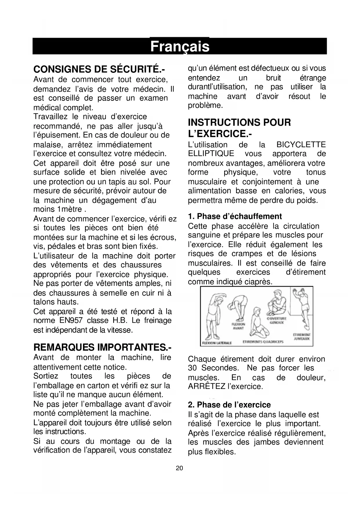 Avant de commencer l'exercice, vérifi ez si toutes les pieces ont bien eté montées sur la machine et si les écrous, vis, pédales et bras sont bien fixés. L'utilisateur de la machine doit porter des vêtements et des chaussures appropriés pour l'exercice physique. Ne pas porter de vêtements amples, ni des chaussures à semelle en cuir ni à talons hauts.