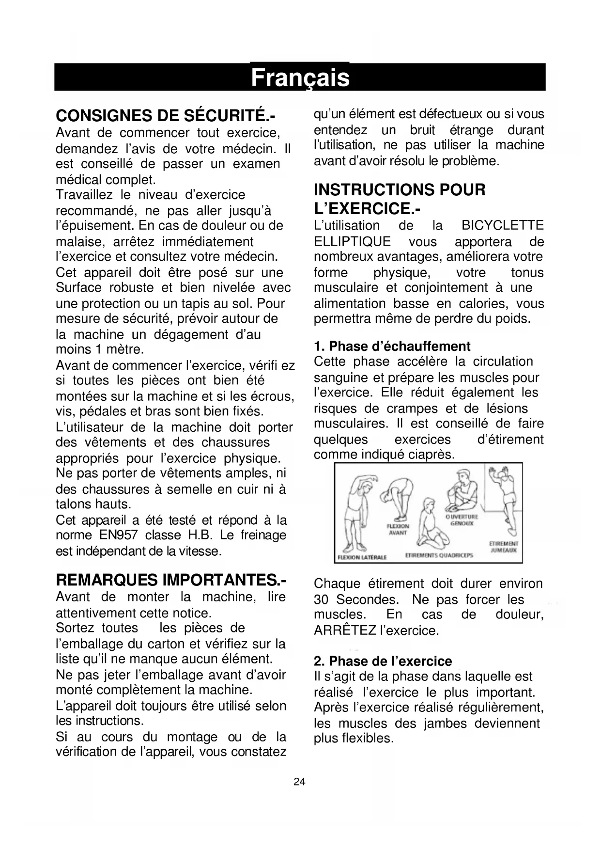Avant de commencer tout exercice, demandez l’avis de votre médecin. Il est conseillé de passer un examen médical complet. Travaillez le niveau d’exercice recommandé, ne pas aller jusqu’à l’épuisement. En cas de douleur ou de malaise, arrêtez immédiatement l’exercice et consultez votre médecin. Cet appareil doit être posé sur une Surface robuste et bien nivelée avec une protection ou un tapis au sol. Pour mesure de sécurité, prévoir autour de la machine un dégagement d’au moins 1 mètre. Avant de commencer l’exercice, vérifi ez si toutes les pièces ont bien été montées sur la machine et si les écrous, vis, pédales et bras sont bien fixés. L’utilisateur de la machine doit porter des vêtements et des chaussures appropriés pour l’exercice physique. Ne pas porter de vêtements amples, ni des chaussures à semelle en cuir ni à talons hauts. Cet appareil a été testé et répond à la norme EN957 classe H.B. Le freinage est indépendant de la vitesse. REMARQUES IMPORTANTES.- Avant de monter la machine, lire attentivement cette notice. Sortez toutes les pièces de l’emballage du carton et vérifiez sur la liste qu’il ne manque aucun élément. Ne pas jeter l’emballage avant d’avoir monté complètement la machine. L’appareil doit toujours être utilisé selon les instructions. Si au cours du montage ou de la vérification de l’appareil, vous constatez qu’un élément est défectueux ou si vous entendez un bruit étrange durant l’utilisation, ne pas utiliser la machine avant d’avoir résolu le problème. INSTRUCTIONS POUR L’EXERCICE.- L’utilisation de la BICYCLETTE ELLIPTIQUE vous apportera de nombreux avantages, améliorera votre forme physique, votre tonus musculaire et conjointement à une alimentation basse en calories, vous permettra même de perdre du poids.