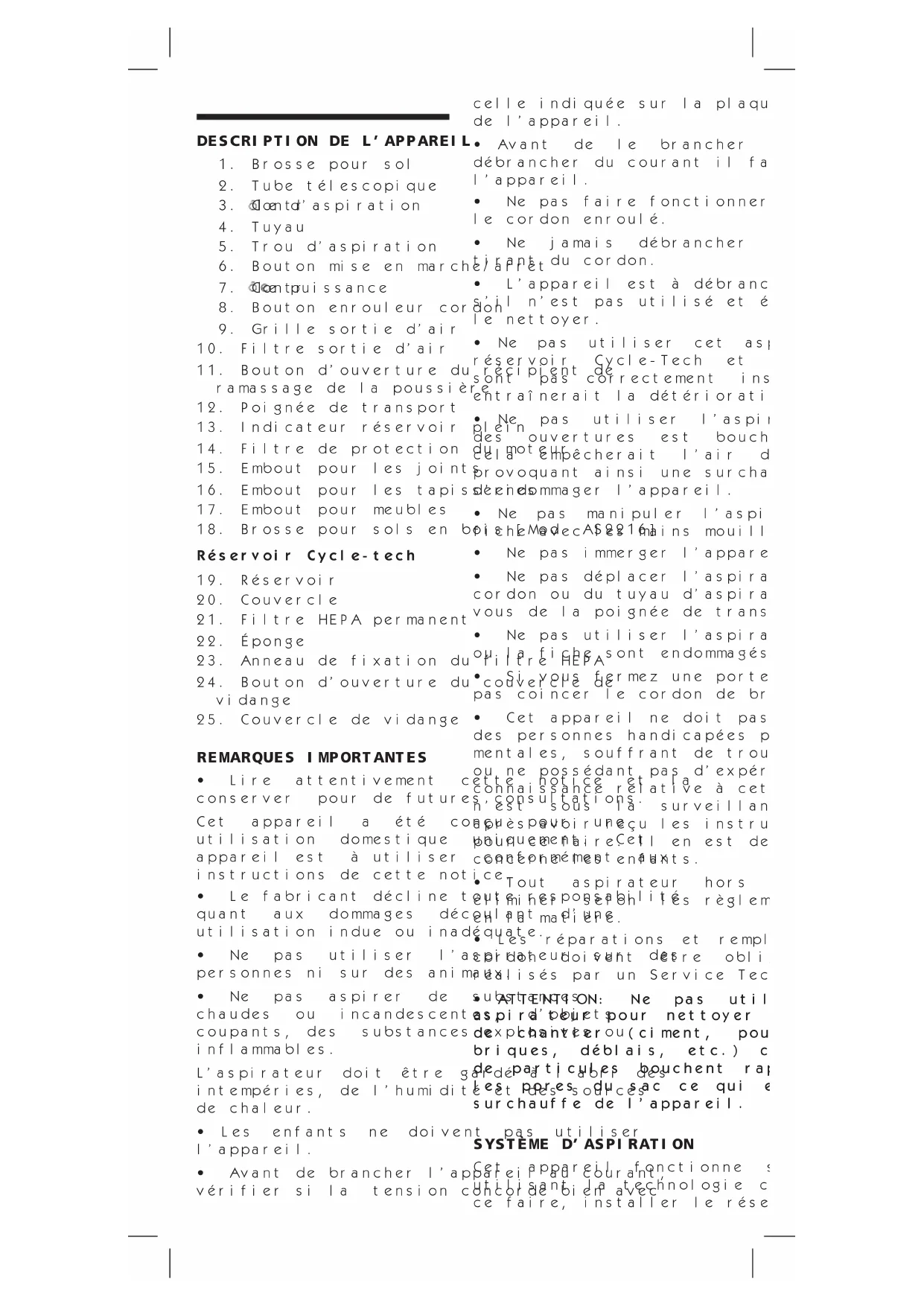 - Ne pas utiliser cet aspirateur si le réservoir Cycle-Tech et le filtre HEPA ne sont pas correctement installés car cela entraînerait la détérioration de l’appareil.
