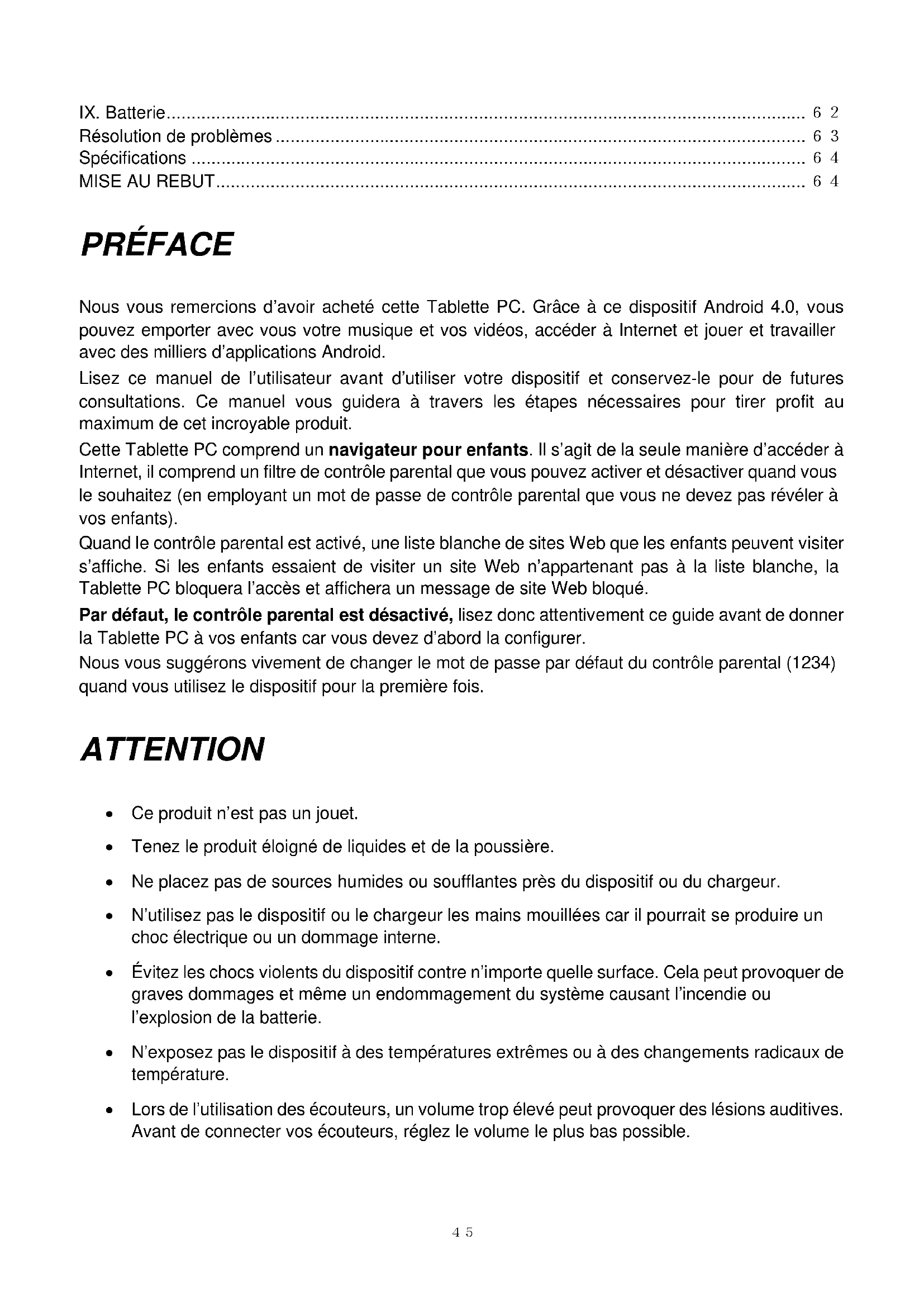 IX. Batterie ................................................................................................................................. 62 Résolution de problèmes ........................................................................................................... 63 Spécifications ............................................................................................................................ 64 MISE AU REBUT ....................................................................................................................... 64 PRÉFACE Nous vous remercions d’avoir acheté cette Tablette PC. Grâce à ce dispositif Android 4.0, vous pouvez emporter avec vous votre musique et vos vidéos, accéder à Internet et jouer et travailler avec des milliers d’applications Android. Lisez ce manuel de l’utilisateur avant d’utiliser votre dispositif et conservez-le pour de futures consultations. Ce manuel vous guidera à travers les étapes nécessaires pour tirer profit au maximum de cet incroyable produit. Cette Tablette PC comprend un navigateur pour enfants. Il s’agit de la seule manière d’accéder à Internet, il comprend un filtre de contrôle parental que vous pouvez activer et désactiver quand vous le souhaitez (en employant un mot de passe de contrôle parental que vous ne devez pas révéler à vos enfants). Quand le contrôle parental est activé, une liste blanche de sites Web que les enfants peuvent visiter s’affiche. Si les enfants essaient de visiter un site Web n’appartenant pas à la liste blanche, la Tablette PC bloquera l’accès et affichera un message de site Web bloqué. Par défaut, le contrôle parental est désactivé, lisez donc attentivement ce guide avant de donner la Tablette PC à vos enfants car vous devez d’abord la configurer. Nous vous suggérons vivement de changer le mot de passe par défaut du contrôle parental (1234) quand vous utilisez le dispositif pour la première fois. ATTENTION