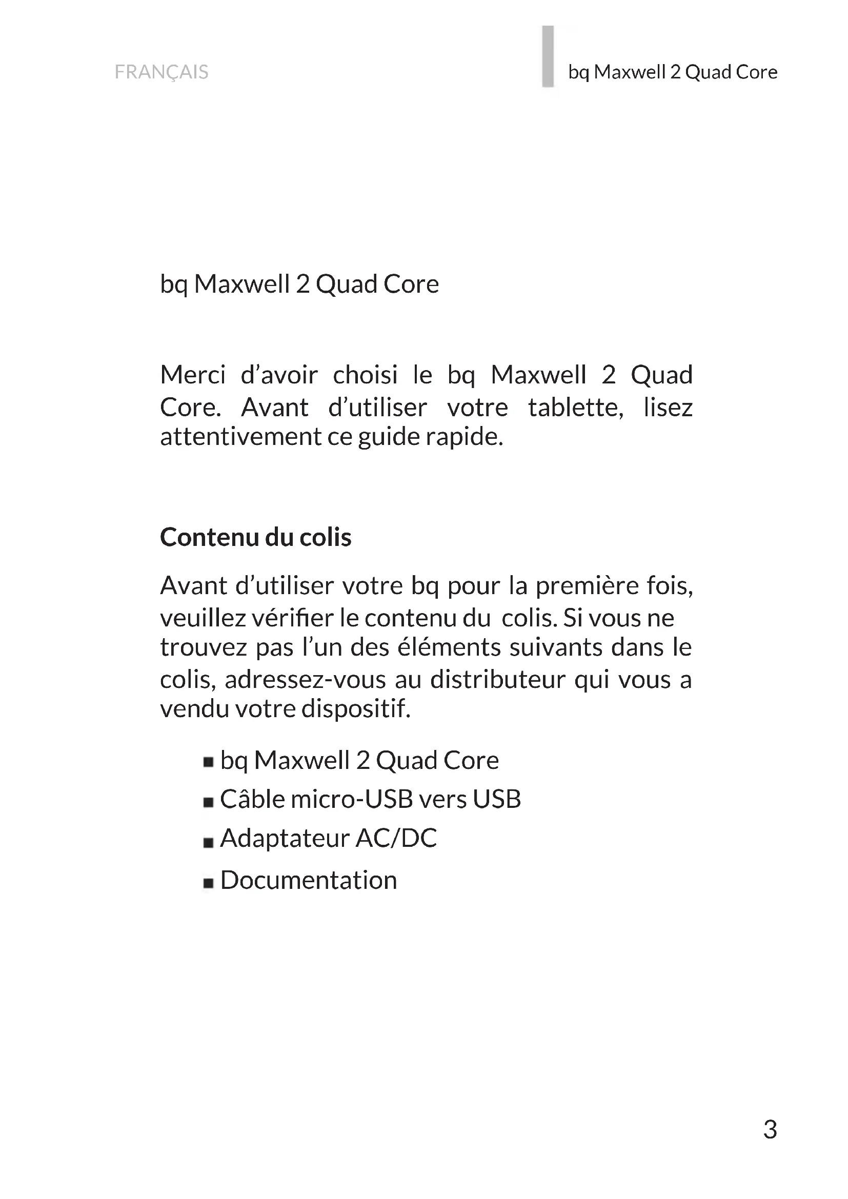 FRANÇAIS bq Maxwell 2 Quad Core Merci d’avoir choisi le bq Maxwell 2 Quad Core. Avant d’utiliser votre tablette, lisez attentivement ce guide rapide. Contenu du colis Avant d’utiliser votre bq pour la première fois, veuillez vérier le contenu du colis. Si vous ne trouvez pas l’un des éléments suivants dans le colis, adressez-vous au distributeur qui vous a vendu votre dispositif. bq Maxwell 2 Quad Core Câble micro-USB vers USB Adaptateur AC/DC Documentationbq Maxwell 2 Quad Core
