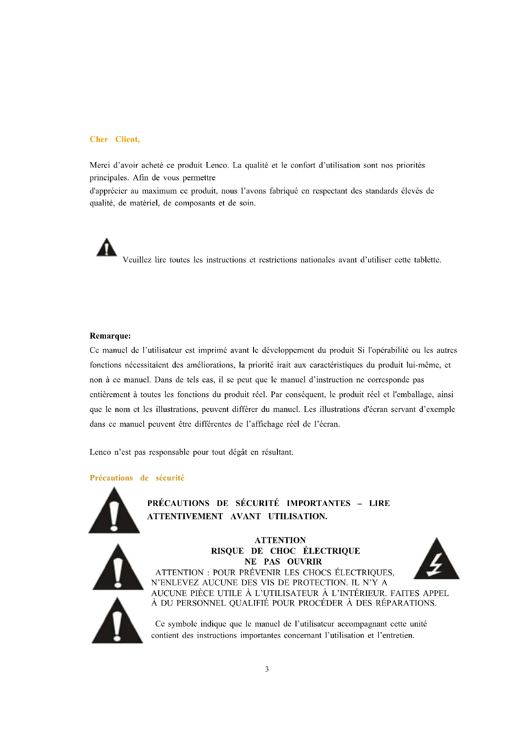 - Précautions -243 Cher Client, Merci d’avoir acheté ce produit Lenco. La qualité et le confort d’utilisation sont nos priorités principales. Afin de vous permettre d'apprécier au maximum ce produit, nous l’avons fabriqué en respectant des standards élevés de qualité, de matériel, de composants et de soin. Veuillez lire toutes les instructions et restrictions nationales avant d’utiliser cette tablette. Remarque: Ce manuel de l’utilisateur est imprimé avant le développement du produit Si l'opérabilité ou les autres fonctions nécessitaient des améliorations, la priorité irait aux caractéristiques du produit lui-même, et non à ce manuel. Dans de tels cas, il se peut que le manuel d’instruction ne corresponde pas entièrement à toutes les fonctions du produit réel. Par conséquent, le produit réel et l'emballage, ainsi que le nom et les illustrations, peuvent différer du manuel. Les illustrations d'écran servant d’exemple dans ce manuel peuvent être différentes de l’affichage réel de l’écran. Lenco n’est pas responsable pour tout dégât en résultant. Précautions de sécurité PRÉCAUTIONS DE SÉCURITÉ IMPORTANTES – LIRE ATTENTIVEMENT AVANT UTILISATION. ATTENTION p. 22