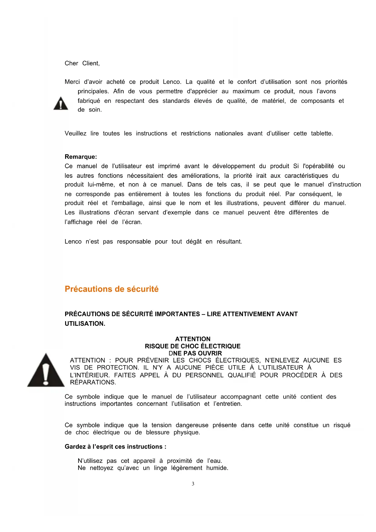 - Points nécessitant votre attention Cher Client, Merci d’avoir acheté ce produit Lenco. La qualité et le confort d’utilisation sont nos priorités principales. Afin de vous permettre d'apprécier au maximum ce produit, nous l’avons fabriqué en respectant des standards élevés de qualité, de matériel, de composants et de soin. Veuillez lire toutes les instructions et restrictions nationales avant d’utiliser cette tablette. Remarque: Ce manuel de l’utilisateur est imprimé avant le développement du produit Si l'opérabilité ou les autres fonctions nécessitaient des améliorations, la priorité irait aux caractéristiques du produit lui-même, et non à ce manuel. Dans de tels cas, il se peut que le manuel d’instruction ne corresponde pas entièrement à toutes les fonctions du produit réel. Par conséquent, le produit réel et l'emballage, ainsi que le nom et les illustrations, peuvent différer du manuel. Les illustrations d'écran servant d’exemple dans ce manuel peuvent être différentes de l’affichage réel de l’écran. Lenco n’est pas responsable pour tout dégât en résultant. Précautions de sécurité PRÉCAUTIONS DE SÉCURITÉ IMPORTANTES – LIRE ATTENTIVEMENT AVANT UTILISATION. ATTENTION p. 283