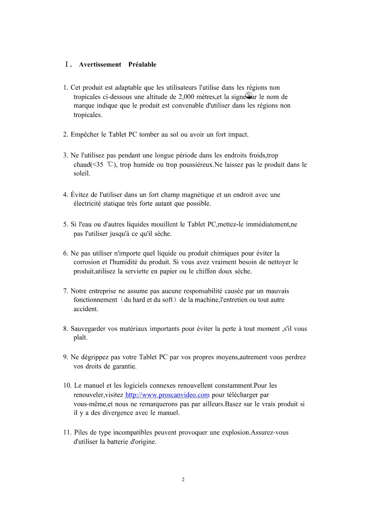 2. Empêcher le Tablet PC tomber au sol ou avoir un fort impact.