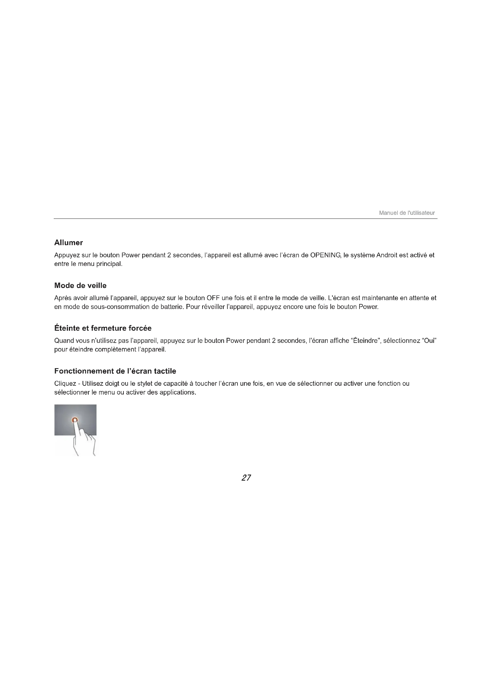 L'appareil a un écran tactile capacitif, il vous suffit de toucher avec le doigt ou cliquez avec le stylo capacitif pour faire les opérations. (Ne jamais utiliser les objets pointus pour cliquer sur l'écran, ou l'écran tactile peut être endommagé).