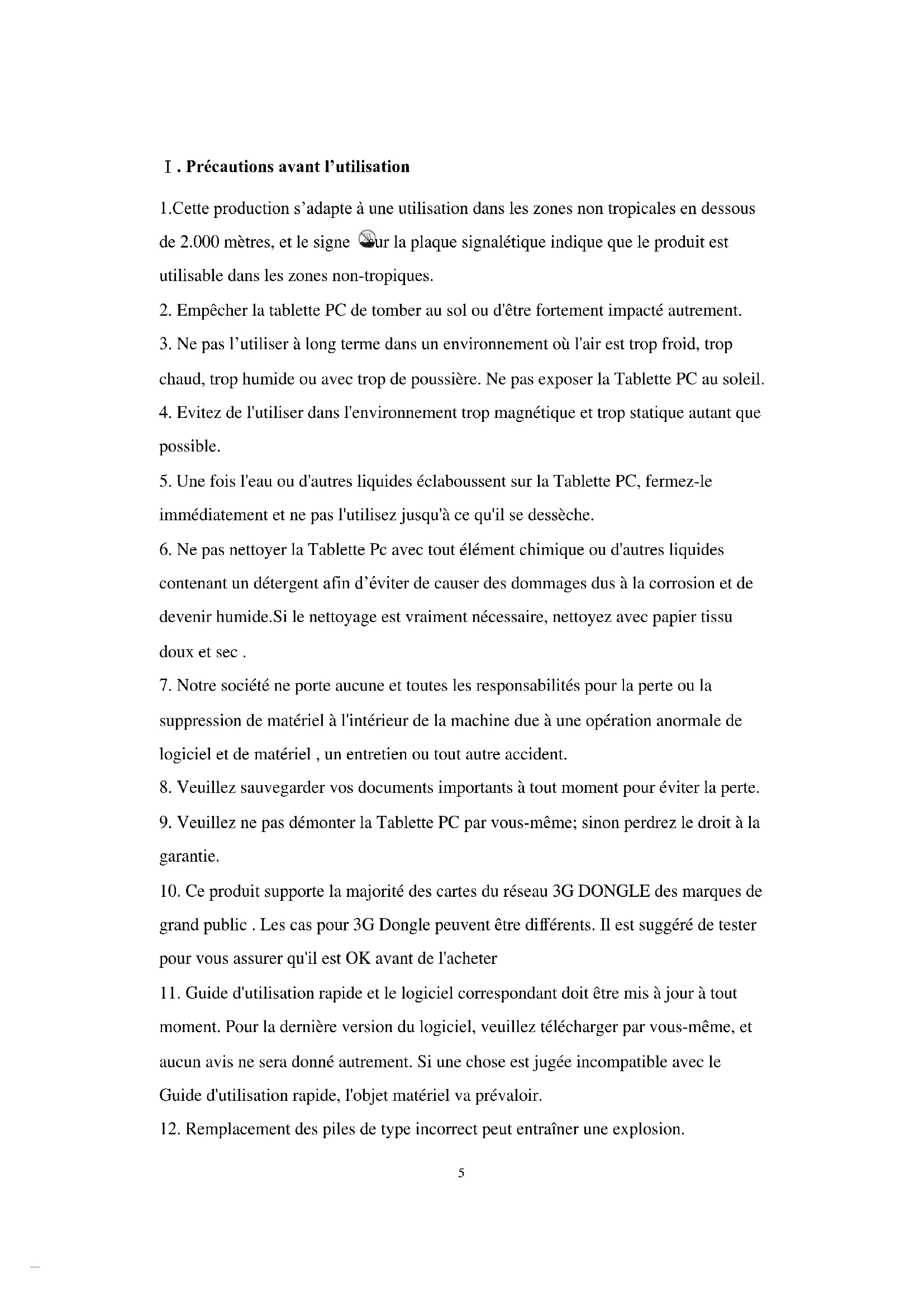 - Veuillez ne pas démonter la Tablette PC par vous-même; sinon perdrez le droit à la garantie.