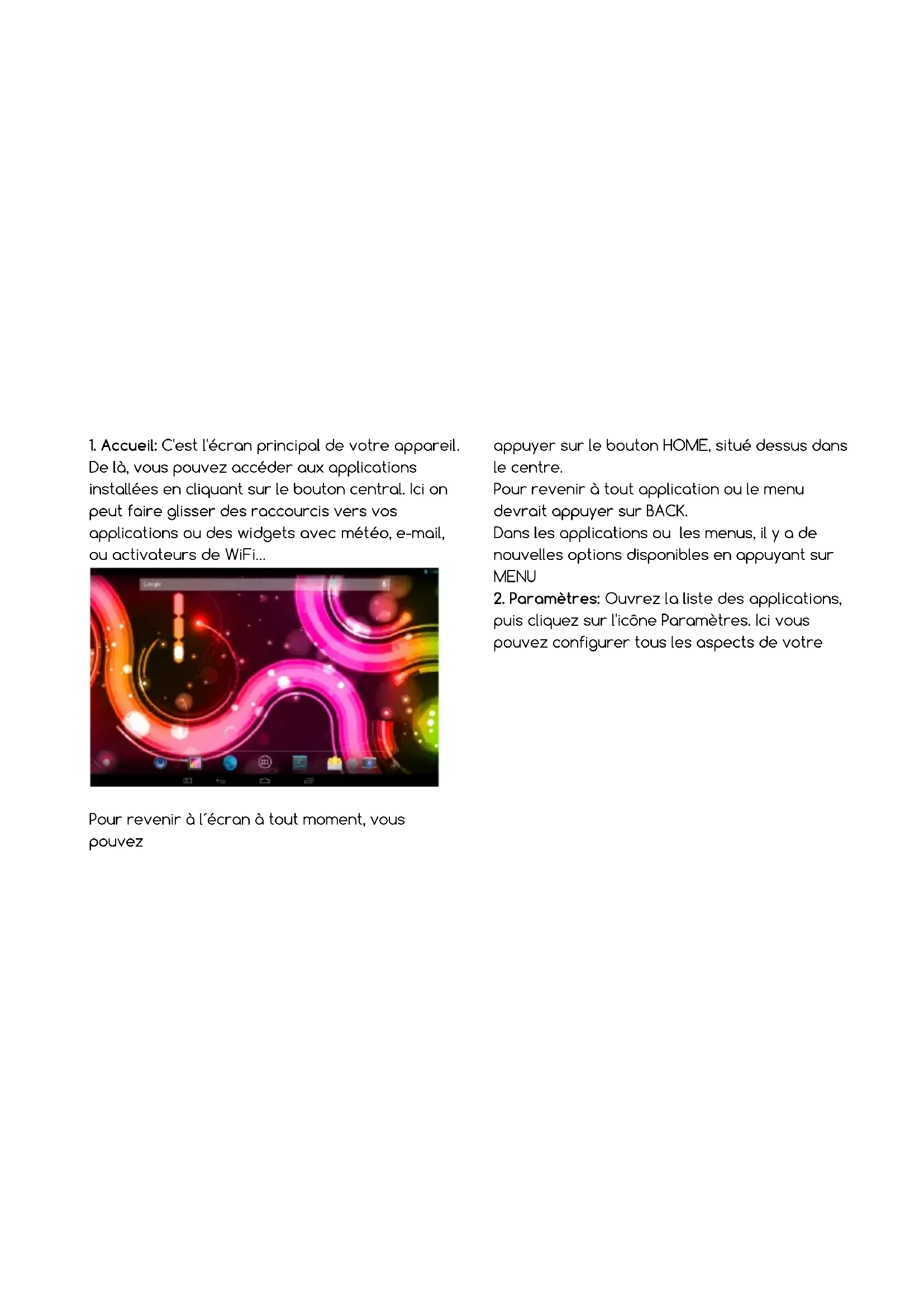 riparazione del prodotto, questi avrà a disposizione 10 giorni lavorativi per ritirare il prodotto. Dopo questo periodo, potrà essere addebitato il costo giornaliero del deposito in base alle dimensioni del prodotto stesso. C/ Mario Roso de Luna, 31 · P.I. Fin de Semana · 28022-Madrid (Spain Tel. +34 902 55 55 60 E-mail: rma@i-joy.es1. Accueil: C'est l'écran principal de votre appareil. De là, vous pouvez accéder aux applications installées en cliquant sur le bouton central. Ici on peut faire glisser des raccourcis vers vos applications ou des widgets avec météo, e-mail, ou activateurs de WiFi… Pour revenir à l´écran à tout moment, vous pouvez appuyer sur le bouton HOME, situé dessus dans le centre. Pour revenir à tout application ou le menu devrait appuyer sur BACK. Dans les applications ou les menus, il y a de nouvelles options disponibles en appuyant sur MENU