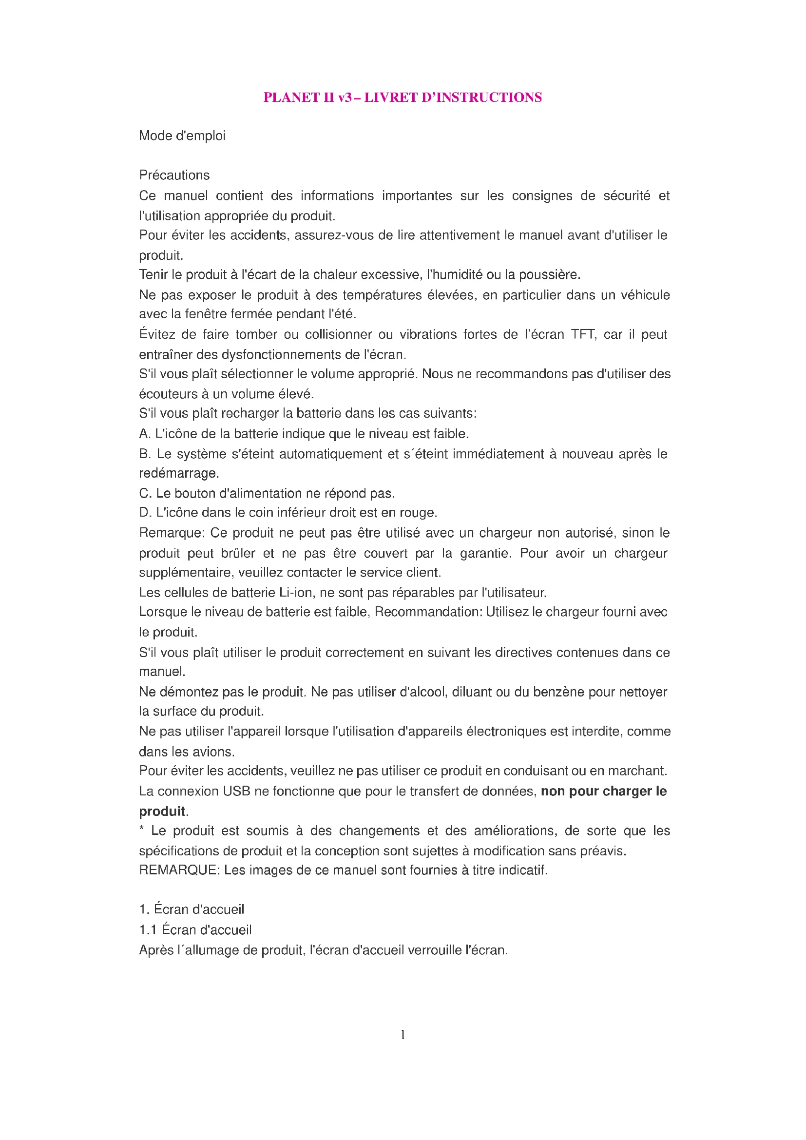 Après l´allumage de produit, l'écran d'accueil verrouille l'écran.PLANET II v3 – LIVRET D’INSTRUCTIONS