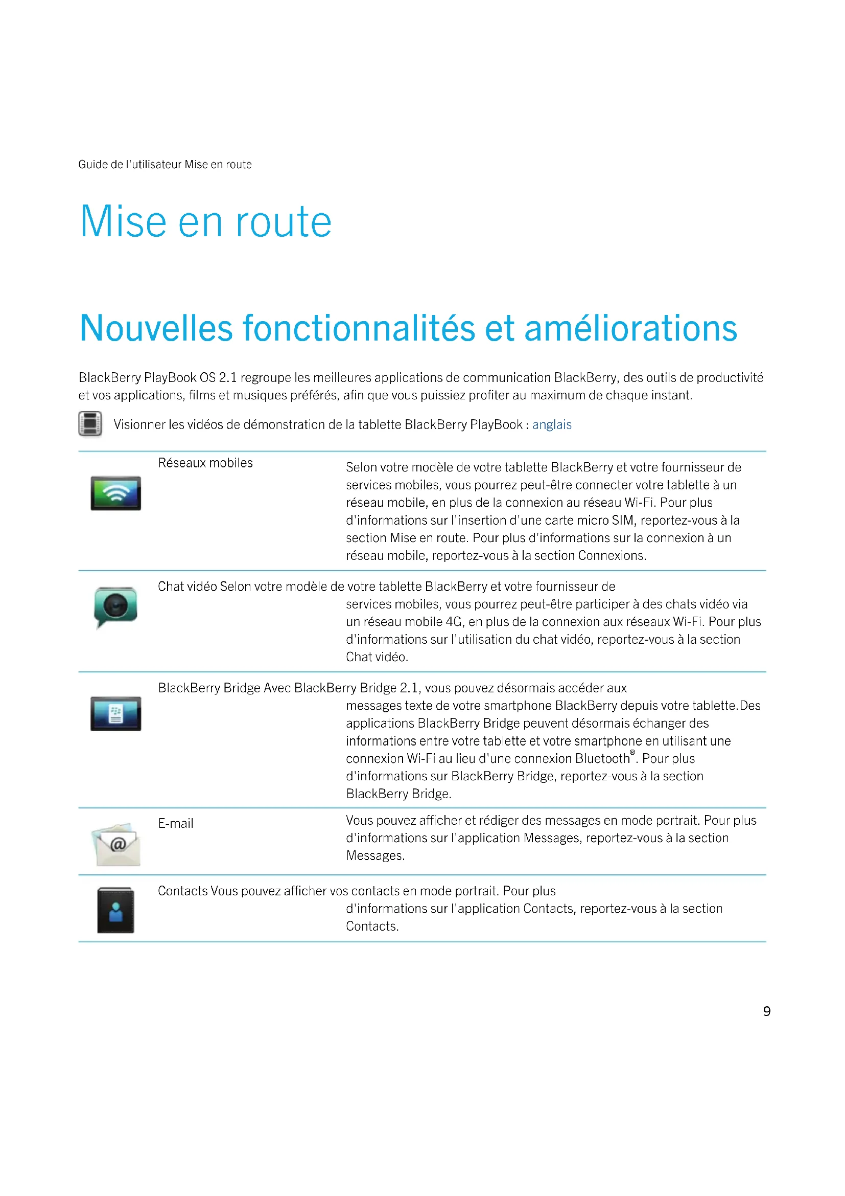 . Pour plus d'informations sur BlackBerry Bridge, reportez-vous à la section BlackBerry Bridge. E-mail Vous pouvez afficher et rédiger des messages en mode portrait. Pour plus d'informations sur l'application Messages, reportez-vous à la section Messages. Contacts Vous pouvez afficher vos contacts en mode portrait. Pour plus d'informations sur l'application Contacts, reportez-vous à la section Contacts. Guide de l'utilisateur Mise en route 9Calendrier Vous pouvez afficher vos calendriers en mode portrait. Pour plus d'informations sur l'application Calendrier, reportez-vous à la section Calendrier. Print To Go Vous pouvez imprimer un document sur votre tablette si celle-ci est connectée à un réseau sans fil différent de celui de votre ordinateur. Pour plus d'informations sur l'utilisation de Print To Go, reportez-vous à la section Print To Go. Familiarisation avec votre tablette Visionner une vidéo sur le matériel de la tablette : anglais Guide de l'utilisateur Mise en route 10Guide de l'utilisateur Mise en route 11Guide de l'utilisateur Mise en route 12Utilisation de l'écran tactile Visionner une vidéo sur l'utilisation de l'écran tactile : anglais Faire défiler l'écran et passer d'un élément à l'autre. Pour parcourir une liste ou des photos, explorer une page Web, et bien plus encore, faites glisser votre doigt verticalement ou horizontalement.