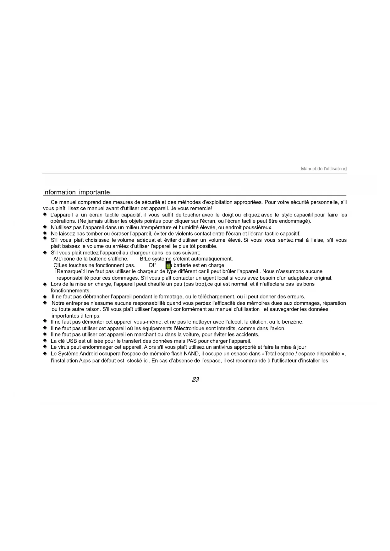 - Cet apparéil utilise la batterie polymère intégrée. Seul le chargeur approprié doit être utilisé.