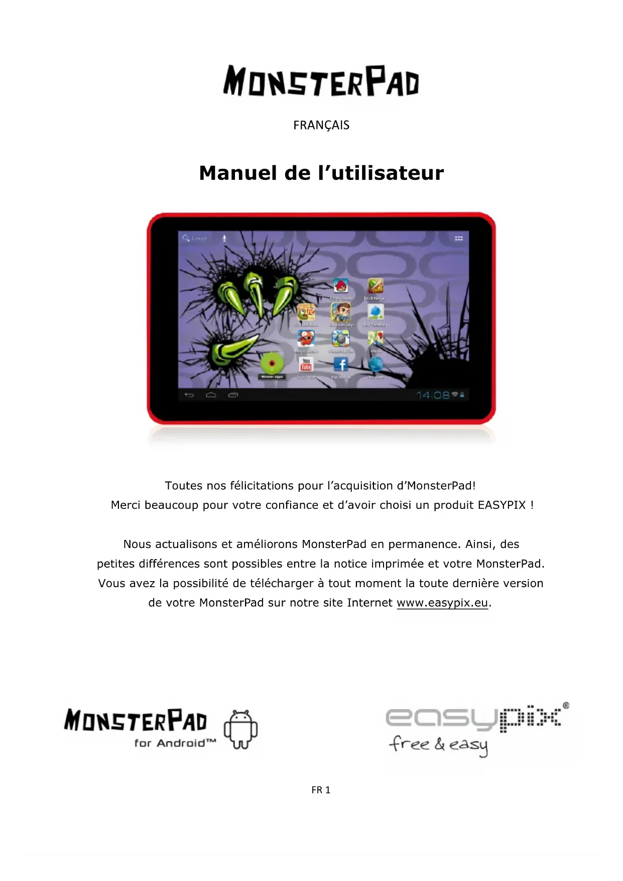 Toutes nos félicitations pour l’acquisition d’MonsterPad! Merci beaucoup pour votre confiance et d’avoir choisi un produit EASYPIX ! Nous actualisons et améliorons MonsterPad en permanence. Ainsi, des petites différences sont possibles entre la notice imprimée et votre MonsterPad. Vous avez la possibilité de télécharger à tout moment la toute dernière version de votre MonsterPad sur notre site Internet www.easypix.eu.